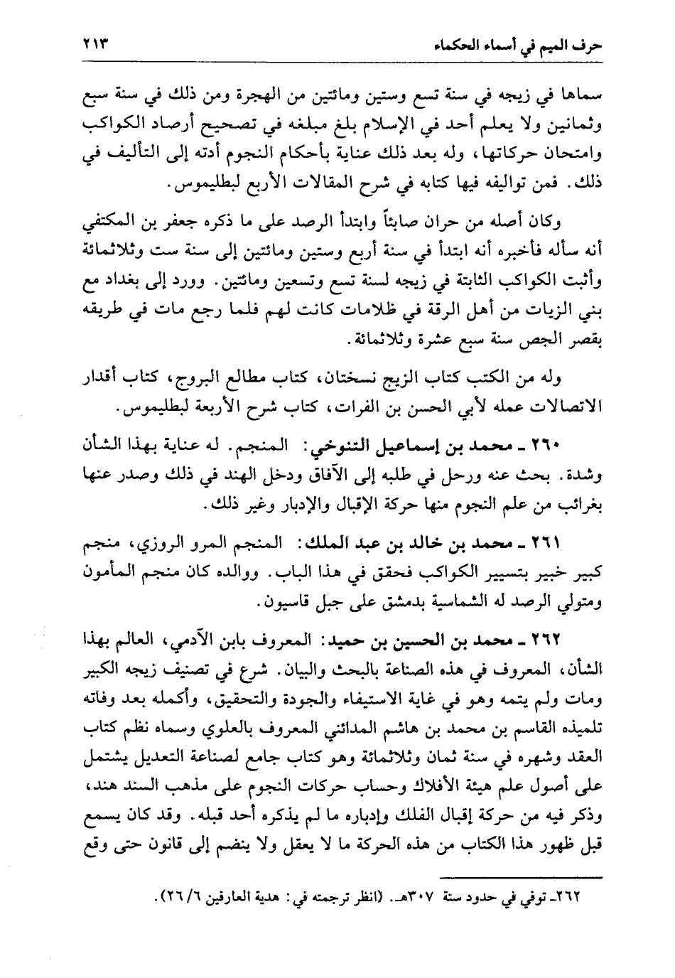 سماها فِي زيجه سنة تسع وستين ومائتين من الهجرة ومن ذَلِكَ فِي سنة سبع وثمانين ولا يعلم أحد فِي الإسلام بلغ مبلغه فِي تصحيح أرصاد الكواكب وامتحان حركاتها وَلَهُ بعد ذَلِكَ عناية بأحكام النجوم أدته إِلَى التأليف فِي لَكَ فمن تواليفه فِيهَا كتابه ف شرح المقالات الأربع لبطليموس وَكَانَ أصله من حران صابئاً وابتدأ عَلَى مَا ذكره جعفر بن المكتفي أنه سأله فأخبره أنه ابتدأ فِي سنة أربع وستين ومائتين إِلَى سنة ست وثلاثمائة وأثبت الكواكب الثابتة فِي زيجه لسنة تسع وتسعين ومائتين وورد إِلَى بغداد مع بني الزيات من أهل الرقة فِي ظلامات كَانَتْ لهم فلما رجع مات فِي طريقه بقصر الحصن سنة سبع عشرة وثلاثمائة وَلَهُ من الكتب. كتاب الزيج نسختان. كتاب مطالع البروج. كتاب أقدار الاتصالات عمله لأبي الحسن بن الفرات. كتاب شرح الأربعة لبطليموس.