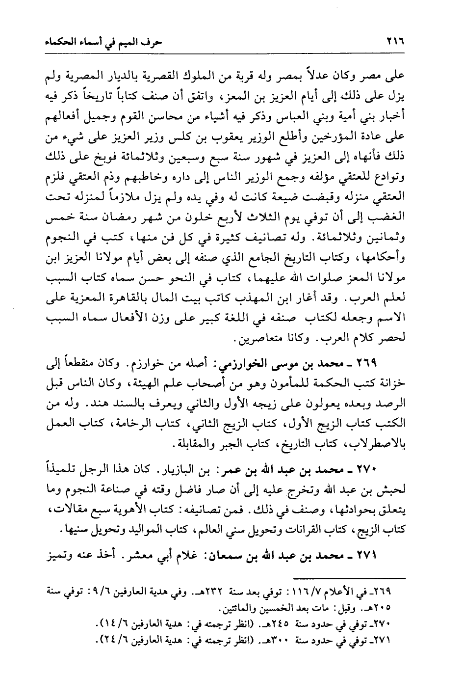 محمد بن موسى الخوارزمي أصله من خوارزم وَكَانَ منقطعاً إِلَى خزانة كتب الحكمة للمأمون وهو من أصحاب علم الهيئة وَكَانَ الناس قبل الرصد وبعده يعولون عَلَى زيجه الأول والثاني ويعرف بالسند هند وهل من الكتب. كتاب الزيج الأول. كتاب الزيج الثاني. كتاب الرخامة. كتاب العمل بالاصطرلاب. كتاب التاريخ. كتاب الجبر والمقابلة.