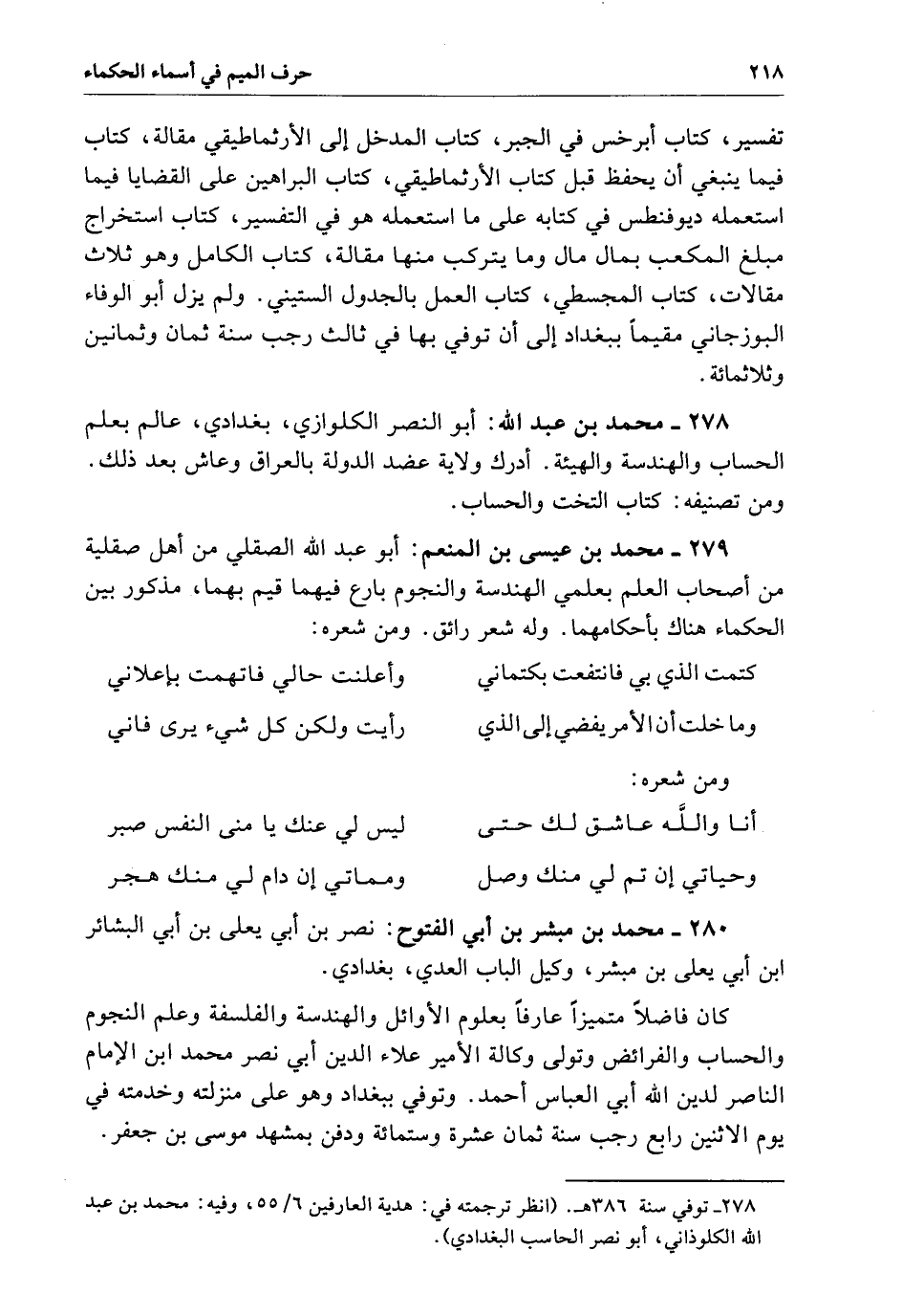 محمد بن عبد الله أبو النصر الكلوازي بغدادي عالم بعلم الحساب والهندسة والهيئة أدرك ولاية عضد الدولة بالعراق وعاش بعد ذَلِكَ ومن تصنيفه. كتاب التخت والحساب.