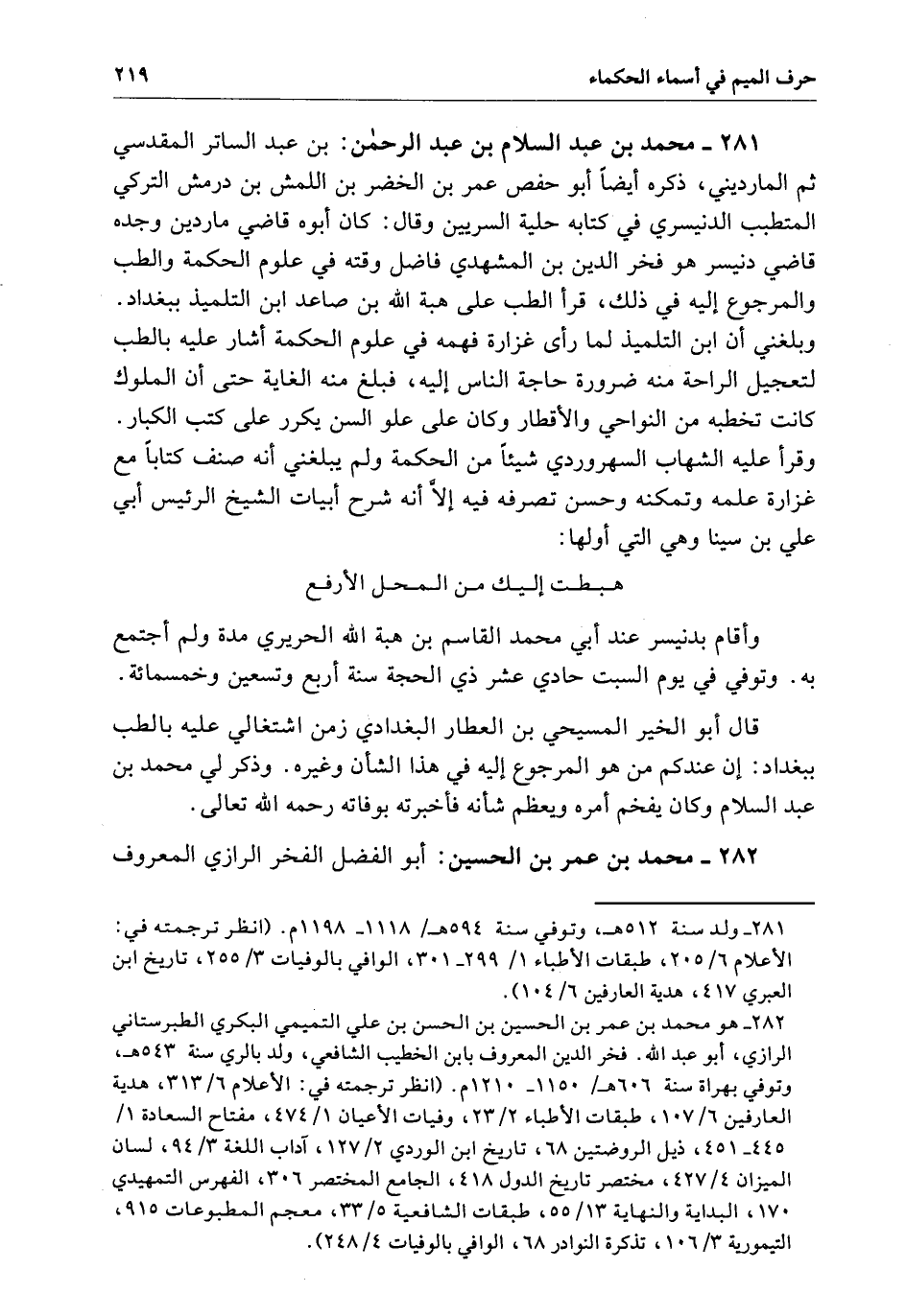 محمد بن عبد السلام بن عبد الرحمن بن عبد الساتر المقدسي ثُمَّ المارديني ذكره أيضاً أبو حفص عمر بن الخضر بن اللمش بن درمش التركي المتطبب الدتيسري فِي كتابه حلية السريين وقال كَانَ أبوه قاضي ماردين وجده قاضي دتيسر هو فخر الدين بن المشهدي فاضل وقته فِي علوم الحكمة والطب والمرجوع إِلَيْهِ فِي ذَلِكَ قرأ الطب عَلَى هبة الله بن صاعد بن التلميذ ببغداد وبلغني أن ابن التلميذ لما رأى غزارة فهمه فِي علوم الحكمة أشار عَلَيْهِ بالطب لتعجيل الراحة منه ضرورة حاجة الإنسان إِلَيْهِ فبلغ منه الغاية حَتَّى أن الملوك كَانَتْ تخطبه من النواحي والأقطار وَكَانَ عَلَى علو السن يكرر عَلَى كتب الكبار وقرأ عَلَيْهِ الشهاب السهروردي شيئاً من الحكمة وَلَمْ يبلغني أنه صنف كتاباً مع غزارة علمه وتمكنه وحسن تصرفه فِيهِ إِلاَّ أنه شرح أبيات الشيخ الرئيس أبي علي بن سينا وهي الَّتِي أولها: