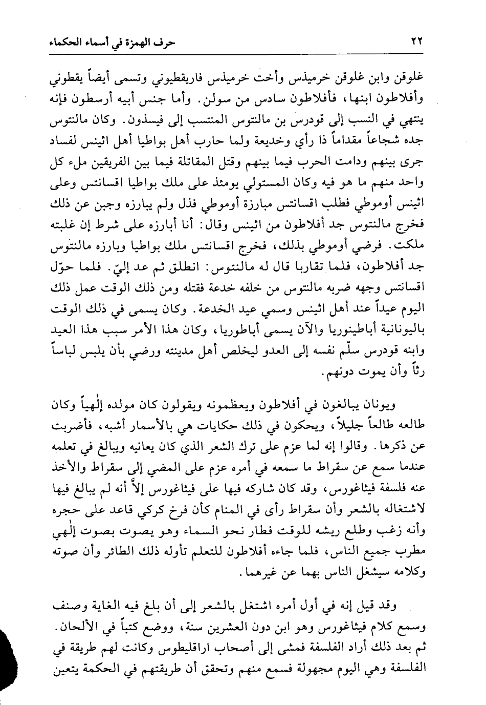 ويونان يبالغون فِي أفلاطون ويعظمونه ويقولون كَانَ مولده إلهياً وَكَانَ طالعه طالعاً جليلاً ويحكون فِي ذَلِكَ حكايات هي بالأسمار أشبه فأضربت عن ذكرها وقالوا أنه لما عزم عَلَى ترك الشعر الَّذِي كَانَ يعانيه ويبالغ فِي تعلمه عندما سمع عن سقراط مَا سمعه فِي أمره عزم عَلَى المضي إِلَى سقراط والأخذ عنه فلسفة فيثاغورس وذد كَانَ شاركه فِيهَا عَلَى فيثاغورس إِلاَّ أنه لَمْ يبالغ فِيهَا لاشتغاله بالشعر وأن سقراط رأى فِي المنام كَأَنَّ رخ كركي قاعد عَلَى حجره وأنه زغب وطلع ريشه للوقب فطار نحو السماء وهو يصوت بصوت إلهي مطرب جميع الناس فلما جاءه أفلاطون للتعلم تأوله ذَلِكَ الطائر وأن صوته وكلامه سيشغل الناس بهما عن غيرهما وَقَدْ قيل أنه فِي أول أمره اشتغل بالشعر إِلَى أن بلغ فِيهِ الغاية وصنف وسمع كلام فيثاغورس وهو ابن دون العشرين سنة ووضع كتباً فِي الألحان ثُمَّ بعد ذَلِكَ أراد الفلسفة فمشى إِلَى أصحاب أراقليطوس وَكَانَتْ لهم طريقة فِي الفلسفة وهي اليوم مجهولة فسمع منهم وتحقق أن طريقتهم فِي الحكمة يتعين