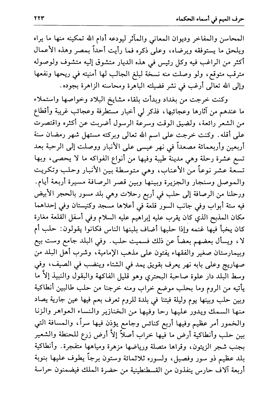 المحاسن وديوان المعاني والمآثر ليودعه أدام الله تمكينه منها مَا يراه ويلحق مَا يستوقفه ويرضاه وَعَلَى ذكره فما رأيت أحداً بمصر وهذه الأعمال أكثر من الراغب فِيهِ وكل رئيس فِي هَذِهِ الديار متشوق إِلَيْهِ متشوف لوصوله مترقب متوقع ولو وصلت منه نسخة بلغ الجالب لَهَا أمنيته فِي ريحها ونفعها وإلى الله تعالى أرغب فِي نشر فضيلته الباهرة ومحاسنه الزاهرة بجوده وكنت خرجت من بغداد وبدأت بلقاء مشايخ البلاد وخواصها واستملاء مَا عندهم من آثارها وعجائبها فذكر لي أخبار مستطرقة وعجائب غريبة وأقطاع من الشعر رائفة ولضيق الوقت وسرعة الرسول أضربت عن أكثره واقتصرت عن أقله وكنت خرجت عَلَى اسم الله تعالى وبركته مستهل شهر رمضان سنة أربعين وأربعمائة مصعداً فِي نهر عيسى عَلَى الأنبار ووصلت إِلَى الرحبة بعد تسع عشرة رحلة وهي مدينة طيبة وفيها من أنواع الفواكه مَا لا يحصى وبها تسعة عشر نوعاً من الأعناب وهي متوسطة بَيْنَ الأنبار وحلب وتكريت والموصل وسنجار والجزيرة وبينها وبين قصر الرصافة مسيرة أربعة أيام ورحلنا من الرصافة إِلَى حلب فِي أربع رحلات وهي بلد بالحجر الأبيض فِيهِ ستة أبواب وَفِي جانب السور قلعة فِي أعلاها مسجد وكنيستان وَفِي إحداهما مكان المذبح الَّذِي كَانَ قرب عَلَيْهِ إبراهيم عَلَيْهِ السلام وَفِي أسفل القلعة مغارة كَانَ يخبأ فِيهَا غنمه وإذا حليها أضاف بلبتها الناس فكانوا يقولون حلب أم لا ويسأل بعضهم بعضاً عن ذَلِكَ فسميت حلب وَفِي البلد جامع وست بيع وبيمارستان صغير والفقهاء يفننون عَلَى مذهب الإمامية وشرب أهل البلد من صهاريج وَعَلَى بابه نهر يعرف بقويق يمد فِي الشتاء وينضب فِي الصيف وَفِي وسط البلد دار علوة صاحبة البحتري وهو قليل الفاكهة والبقول والنبيذ إِلاَّ مَا يأتيه من الروم وَمَا بحلب موضع خراب ومنه خرجنا من حلب طالبين أنطاكية وبين حلب وبينها يوم وليلة فبتنا فِي بلدة للروم تعرف بعم فِيهَا عين جارية يصاد منها السمك ويدور عَلَيْهَا رحا وفيها من الخنازير والنساء العواهر والزنا والخمور أمر عظيم وفيها أربع كنائس وجامع يؤذن فِيهَا سراً والمسافة الَّتِي بَيْنَ حلب وأنطاكية أرض مَا فِيهَا خراب أصلاً إِلاَّ أرض زرع للحنطة والشعير بجنب شجر الزيتون وقراها متصلة ورياضها مزهرة ومياهها متفجرة وأنطاكية بلد عظيم ذو سور وفصيل ولسوره ثلاثمائة وستون برجاً يطوف عَلَيْهَا بنوبة أربعة آلاف حارس ينفذون من القسطنطينية من حضرة الملك فيضمنون حراسة