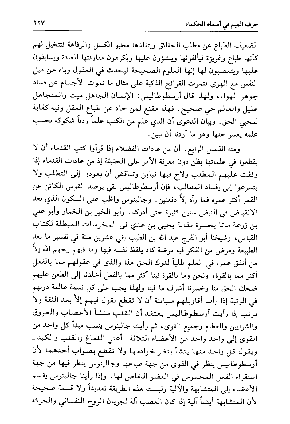ومنه الفصل الرابع أن من عادات الفضلاء إِذَا قرؤوا كتب القدماء أَن لا يقطعوا فِي علمائها يظن دون معرفة الأمر عَلَى الحقيقة إذ من عادات القدماء إِذَا وقفت عليهم المطالب ولاح فِيهَا تباين وتناقض أن يعودوا إِلَى التطلب ولا يتسرعوا إلى إفساد المطالب فإن أرسطوطاليس بقي يرصد القوس الكائن عن القمر أكثر عمره غما رآه إِلاَّ دفعتين وجالينوس واظب عَلَى السكون الَّذِي بعد الانقباض فِي النبض سنين كثيرة حَتَّى أدركه وأبو الخير بن الخمار وأبو علي بن زرعة ماتا بحسرة مقالة يحيى بن عدي فِي المخرسات المبطلة لكتاب القياس وشيخنا أبو الفرج عبد الله بن الطيب بقي عشرين سنة فِي تفسير مَا بعد الطبيعة ومرض من الفكر فِيهِ مرضة كاد يلفظ فِيهَا وَمَا فيهم رحمهم الله إِلاَّ من أنفق عمره فِي العلم طلباً لإدراك الحق هَذَا والي فِي عقولهم مما بالفعل أكثر مما بالقوة ونحن وَمَا بالقوة فينا أكثر مما بالفعل أخلدنا إِلَى الطعن عليهم ضحك الحق منا وخسرنا أشرف مَا فينا ولهذا يجب عَلَى كل نسمة عالمة دونهم فِي الرتبة إِذَا رأت أقاويلهم متباينة أن لا تقطع بقول فيهم إِلاَّ بعد الثقة ولا ترتب إِذَا رأيت أرسطوطاليس يعتقد أن القلب منشأ الأعصاب والعروق والشرايين والعظام وجميع القوى ثُمَّ رأيت جالينوس ينسب مبدأ كل واحد من القوى إِلَى واحد واحد من الأعضاء الثلاثة أعني الدماغ والقلب والكبد ويقول كل واحد منها ينشأ ينظر خوادمها ولا تقطع بصواب أحدهما لأن أرسطوطاليس ينظر فِي القوى من جهة طباعها وجالينوس ينظر فِيهَا من جهة استقراء الفعل المحسوس فِي العضو الخاص لَهَا وإذا رأينا جالينوس يقسم الأعضاء إِلَى المتشابهة والآلية وليست هَذِهِ الطريقة تعديداً ولا قسمة صحيحة لأن المتشابهة أيضاً آلية إِذَا كَانَ العصب آلة لجريان الروح النفساني والحركة
