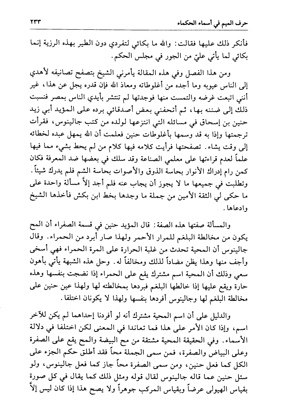 فأنكر ذَلِكَ عَلَيْهَا فقالت والله مَا بكائي لتفردي دون الطير بهذه الرزية إنما بكائي لما يأتي علي من الجور فِي مجلس الحكم .. ومن هَذَا الفصل وَفِي هَذِهِ المقالة يأمرني الشيخ بتصفح تصانيفه لأهدي إِلَى الناس عيوبه وَمَا أجده من أغلوطاته ومعاذ الله فإن قدره يجل عن هَذَا غير أنني اتبعت غرضه والتمست منها فوجدتها لَمْ تنتشر بأيدي الناس بمصر فنسبت ذَلِكَ إِلَى ضنته بِهَا ثُمَّ أتحفني بعض أصدقائي برده عَلَى المؤيد أبي زيد حنين بن إسحاق فِي مسائله الَّتِي انتزعها لولده من كتب جالينوس فقرأت ترجمتها وإذا بِهِ قَدْ وسمها بأغلوطات حنين فعلمت أن الله يمهل عبده لخطائه إلي وقت يشاء تصفحتها فرأيت كلامه فِيهَا كلام من لَمْ يحط بشيء مما فِيهَا علماً لعدم قراءتها عَلَى معلمي الصناعة وَقَدْ سلك فِي بعضها ضد المعرفة فكان كمن رام إدراك الألورا بحاسة الذوق والأصوات بحاسة الشم فلم يدرك شيئاً وتطلبت فِي جميعها مَا لا يجوز أن يجاب عنه فلم أجد إِلاَّ مسألة واحدة عَلَى مَا حكى لي الثقة الأمين من جملة مَا وجدها بخط ابن بكش فأخذها الشيخ وادعاها .. والمسألة صفتها هَذِهِ الصفة قال المؤيد حنين فِي قسمة الصفراء أن المح يكون من مخالطة البلغم للمرار الأحمر ولهذا صار أبرد من الحمراء وقال جالينوس أن المحبة تحدث من غلبة الحمراء فهي أسخن وأجف منها وهذا يظن مضاداً لذلك ومخالفاً لَهُ وحل هَذِهِ الشبهة يأتي بأهون سعي ذَلِكَ أن المحبة اسم مشترك يقع عَلَى الحمراء إِذَا نضجت بنفسها وهذه حارة ويقع عَلَيْهَا إِذَا خالطها البلغم فيردها بمخالطته لَهَا ولهذا عين حنين عَلَى مخالطة البلغم لَهَا وجالينوس أفردها بنفسها ولهذا لا يكونان اختلفا والدليل عَلَى أن اسم المحية مشترك أنه لو أفردنا إحداهما لَمْ يكن للآخر اسم وإذا كَانَ الأمر عَلَى هَذَا فما تعاندا فِي المعنى لكن اختلفا فِي دلالة الأسماء وَفِي الحقيقة المحية مشتقة من مح البيضة والمح يقع عَلَى الصفرة وَعَلَى البياض والصفرة فمن سمى الجملة محا فقد أطلق حكم الجزء عَلَى الكل كما فعل حنين ومن سمى الصفرة مجا جاز كما فعل جالينوس ولو سئل حنين عما قاله جالينوس لقال بقوله ومثل ذَلِكَ كما يقال فِي كل صورة بقياس الهيولى عرضاً وبقياس المركب جوهراً ولا يصح هَذَا إِذَا كَانَ لَيْسَ إِلاَّ