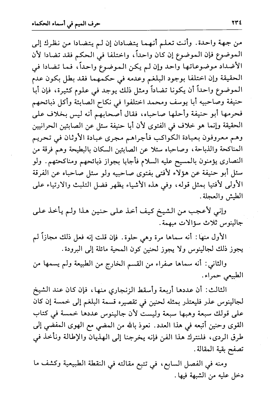 من جهة واحدة وأنت تعلم أنهما يتضادان إِن لن يتضادا من نظرك إِلَى الموضوع فإن الموضوع إِن كَانَ واحداً واختلاف فِي الحكم فقد تضادا لأن الأضداد موضوعها واحد وإن لَمْ يكن الموضوع واحداً فما تضادا فِي الحقيقة وإن اختلفا بوجود البلغم وعدمه فِي حكمهما فقد بطل بكون عدم الموضوع واحداً أن يكونا تضادا ومثل ذَلِكَ يوجد فِي علوم كثيرة فإن أبا حنيفة وصاحبيه أبا يوسف ومحمد اختلفوا فِي نكاح الصابئة وأكل ذبائحهم فحرمها أبو حنيفة وأحلها صاحباه فقال أصحابهم أنه لَيْسَ بخلاف عَلَى الحقيقة وإنما هو خلاف فِي الفتوى لأن أبا حنيفة سئل عن الصابئين الحرانيين وهم معروفون بعبادة الكواكب فأجرهم مجرى عبدة الأوثان فِي تحريم المناكحة والذباحة وصاحباه سئلا عن الصابئين السكان بالبطيحة وهم فرقة من النصارى يؤمنون بالمسيح عَلَيْهِ السلام فأجابا بجواز ذبائحهم ومناكحتهم ولو سئل أبو حنيفة عن هؤلاء لأفتى بفتوى صاحبيه ولو سئل صاحباه عن الفرقة لأولي لافنيا بمثل قوله وَفِي هَذِهِ الأشياء يظهر فضل التلبث والارتياء عَلَى الطيش والعجلة وإني لأعجب من الشيخ كَيْفَ أخذ عَلَى حنين هَذَا وَلَمْ يأخذ عَلَى جالينوس ثلاث سؤالات مبهمة الأول منها أنه سماها مرة ةهي حلوة فإن قلت أنه فعل ذَلِكَ مجازاً لَمْ يجوز ذَلِكَ لجالينوس ولا يجوز لحنين كون المحية مائلة إِلَى البرودة والثاني أنه سماها صفراء من القسم الخارج من الطبيعة وَلَمْ يسمها من الطبيعي حمراء الثالث أن عددها أربعة وأسقط الزنجاري منها فإن كَانَ عند الشيخ لجالينوس عذر فليعتذر بمثله لحنين فِي تقصيره قسمة البلغم إِلَى خمسة إِن كَانَ عَلَى قولك سبعة وهبها سبعة وليست