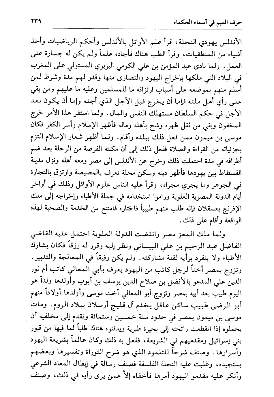 الأندلس يهودي النحلة قرأ علم الأوائل بالأندلس وأحكم الرياضات وأخذ أشياء من المنطقيات وقرأ الطب هناك فأجاده علما وَلَمْ يكن لَهُ جسارة عَلَى العمل ولما نادى عبد المؤمن بن علي الكومي البربري المتولي عَلَى المغرب فِي البلاد الَّتِي ملكها بإخراج اليهود والنصارى منها وقدر لهم مدة وشرط لمن أسلم منهم بموضعه عَلَى أسباب ارتزاقه مَا للمسلمين وعليه مَا عليهم ومن بقى عَلَى رأي أهل ملته فلما أم يخرج قبل الأجل الَّذِي أجله وَمَا أن يكون بعد الأجل فِي حكم السلطان مستهلك النفس والمال ولما استقر هَذَا الأمر خرج المخفون وبقى من ثقل ظهره وشح بأهله وماله فأظهر الإسلام وأسر الكفر فكان موسى بن ميمون ممن فعل ذَلِكَ ببلده وأقام ولما أظهر شعار الإسلام التزم بجزئياته من القراءة والصلاة لفعل ذَلِكَ إلى أن مكنته الفرصة من الرحلة بعد ضم أطرافه فِي مدة احتملت ذَلِكَ وخرج عن الأندلس إلى مصر ومعه أهله ونزل مدينة الفسطاط بَيْنَ يهودها فأظهر دينه وسكن محله تعرف بالمصيصة وارتزق بالتجارة فِي الجوهر وَمَا يجري مجراه وقرأ عَلَيْهِ الناس علوم الأوائل وذلك فِي أواخر أيام الدولة المصرية العلوية وراموا استخدامه فِي جملة الأطباء وإخراجه إلى ملك الإفرنج بعسقلان فإنه طلب منهم طبيباً فاختاروه فامتنع من الخدمة والصحبة لهذه الواقعة وأقام عَلَى ذَلِكَ ولما ملك المعز مصر وانقضت الدولة العلوية اشتمل عَلَيْهِ القاضي الفاضل عبد الرحيم ابن علي البيساني ونظر إليه وقرر لَهُ رزقا فكان يشارك الأطباء ولا ينفرد برأيه لقلة مشاركته وَلَمْ يكن رقيقاً فِي المعالجة وتزوج بمصر أختا لرجل كاتب من اليهود يعرف بأبي المعالي كاتب أم نور الدين عَلَى المدعو بالأفضل بن صلاح الدين يوسف ابن أيوب وأولدها ولداً هو اليوم طبيب بعد أبيه بمصر وتزوج أبو المعالي أخت موسى وأولدها أولادا منهم أبو الرضى طبيب ساكن عاقل يخدم آل قليج أرسلان ببلاد الروم ومات موسى بن ميمون بمصر فِي حدود سنة خمسين وستمائة وتقدم إلى مخلفيه أن يحملوه إذا انقطعت رائحته إلى بحيرة طبرية ويدفنوه هناك طلباً لما فِيهَا من قبور بني إسرائيل ومقدميهم فِي الشريعة ففعل بِهِ ذَلِكَ وَكَانَ بشريعة اليهود وأسرارها وصنف شرحاً للتلمود الَّذِي هو شرح التوراة وتغيرها وبعضهم يستجيده وغلبت عَلَيْهِ النحلة الفلسفية فصنف رسالة إبطال المعاد الشرعي وأنكر عَلَيْهِ مقدمو اليهود أمرها فأخفاه إلا عمن يرى رأيه فِي ذَلِكَ وصنف