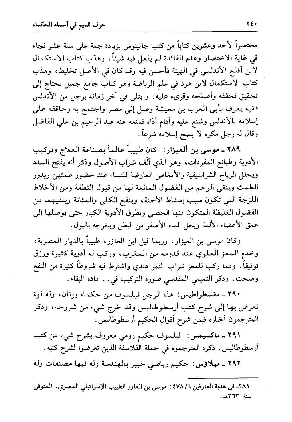 مختصراً لأحد وعشرين كتاباً من كتب جالينوس بزيادة جمة عَلَى ستة عشر فجاءه فِي غاية الاختصار وعدم الفائدة لَمْ يفعل فِيهِ شيئاً وهذب كتاب الاستكمال لابن أفلح الأندلس فِي الهيئة فأحسن فِيهِ وَقَدْ كَانَ فِي الأصل تخليط وهذب كتاب الاستكمال لابن هود فِي علم الرياضة وهو كتاب جامع جميل يحتاج إلى تحقيق فحققه وأصلحه وقرئ عَلَيْهِ وابتلى فِي آخر زمانه برجل من الأندلس فقيه يعرف بأبي العرب بن معيشة وصل إلى مصر واجتمع بِهِ وحاققه عَلَى إسلامه بالأندلس وشنع عَلَيْهِ وأدام أذاه فمنعه عنه عبد الرحيم بن علي الفاضل وقال لَهُ رجل مكره لا يصح إسلامه شرعاً.