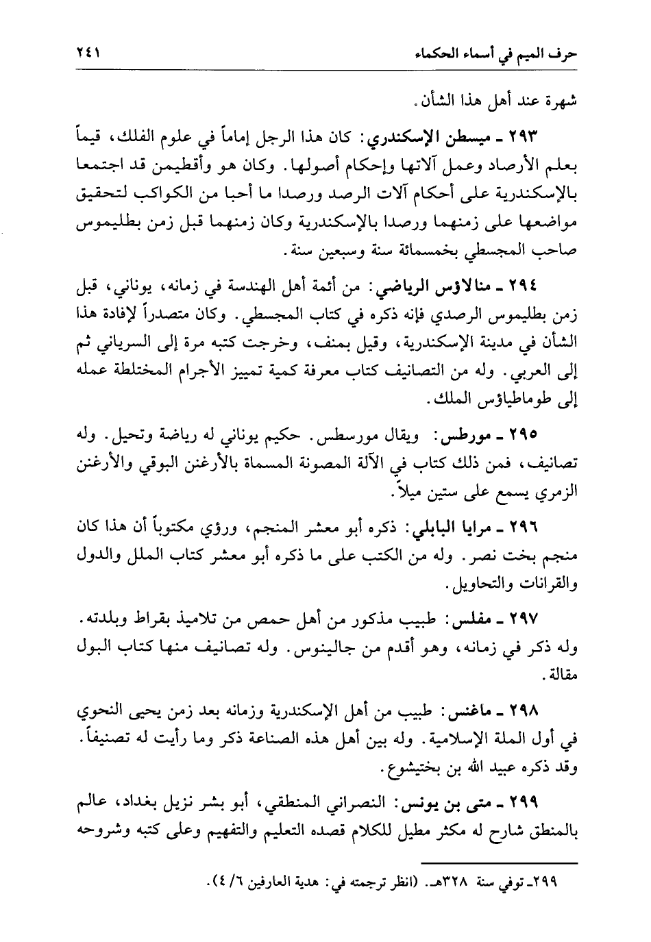 مرايا البابلي ذكره أبو معشر المنجم ورؤى مكتوباً أن هَذَا كَانَ منجم بخت نصر وَلَهُ من الكتب عَلَى مَا ذكره أبو معشر كتاب الملل والدول والقرانات والتحاويل مفلس طبيب مذكور من أهل حمص من تلاميذ بقراط وبلدته وَلَهُ ذكر فِي زمانه وهو أقدم من جالينوس وَلَهُ تصانيف منها كتاب البول مقالة.