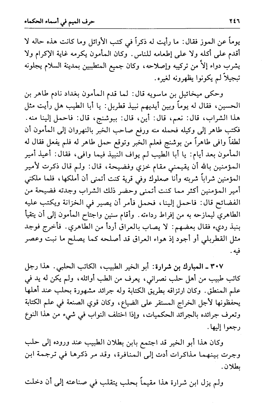 وحكى ميخائيل بن ماسويه قال لما قدم المأمون بغداد نادم طاهر بن الحسين فقال لَهُ يوماً وبيم أيديهم نبيذ قطربل يَا أبا الطيب هل رأيت مثل هَذَا الشراب قال نعم قال أين قال ببوشنج قال فاحمل إلينا منه فكتب طاهر إلى وكيله فحمل منه ورفع صاحب الخبر بالنهروان إلى المأمون إن لطفاً وافي طاهراً من بوشنج فعلم الخبر وتوقع حمل طاهر لَهُ فلم يفعل فقال لَهُ المأمون بعد أيام يَا أبا الطيب لَمْ يواف النبيذ فيما وافى فقال أعيذ أمير المؤمنين بالله أن يقيمني مقام خزي فضيحة قال وَلَمْ قال ذكرت لأمير المؤمنين شراباً شربته وأنا صعلوك وَفِي قرية كنت أتمنى أن أملكها فلما ملكني أمير المؤمنين أكثر مما كنت أتمنى وحضر ذَلِكَ الشراب وجدته فضيحة من الفضائح قال فاحمل فأمر أن يصير فِي الخزانة ويكتب عَلَيْهِ الطاهري ليمازحه بِهِ من افراط رائته وأقام سنين واحتاج المأمون إلى أن يتقيأ بنبذ رديء فقال بعضهم لا يصاب بالعراق أردأ من الطاهري فأخرج فوجد مثب القطربلي أو أجود إذا هواء العرق قَدْ أصلحه كما يصلح مَا نبت وعصر فِيهِ المبارك بن شرارة أبو الخير الطبيب الكاتب الحلبي هَذَا رجل كاتب طبيب من أهل حلب نصراني يعرف من الطب أوائله وَلَمْ يكن لَهُ يد فِي علم المنطق وَكَانَ ارتزاقه بطريق الكتابة وَلَهُ جرائد مشهورة بحلب عند أهلها يحفظونها لأجل الخراج المستقر عَلَى الضياع وَكَانَ قوي الصنعة فِي علم الكتابة وتعرف جرائده بالجرائد الحكميات وإذا اختلف النواب فِي شيء من هَذَا النوع رجعوا إليها وَكَانَ هَذَا أبو الخير قَدْ اجتمع بابن بطلان الطبيب عند ورود إلى حلب وجرت بينهما مذاكرات أدت إلى المنافرة وقدم ذكرها فِي ترجمة ابن بطلان وَلَمْ يزل ابن شرارة هَذَا مقيماً بحلب يتقلب فِي صناعته إلى أن دخلت