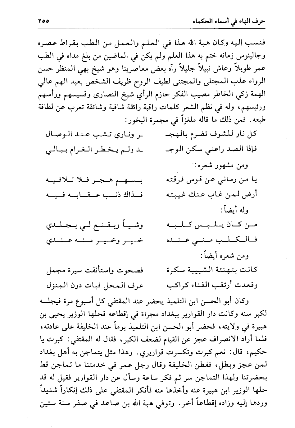 فنسب إِلَيْهِ وَكَانَ هبة الله هَذَا فِي العلم والعمل من الطب بقراط عصره وجالينوس زمانه ختم بِهِ هَذَا العلم وَلَمْ يكن فِي الماضين من بلغ مداه فِي الطب عمر طويلاً وعاش نبيلاً جليلاً رآه بعض معاصرينا وهو شيخ بهي المنظر حسن الرواء عذب المجتلى والمجتنى لطيف الروح ظريف الشخص بعيد الهم عالي الهمة زكي الخاطر مصيب الفكر حازم الرأي شيخ النصارى وقسيسهم ورأسهم ورئيسهم وَلَهُ فِي نظم الشعر كلمات راقية شافية وشائقة تعرب عن لطافة طبعه فمن ذَلِكَ مَا قاله ملغزاً فِي مجمرة البخور