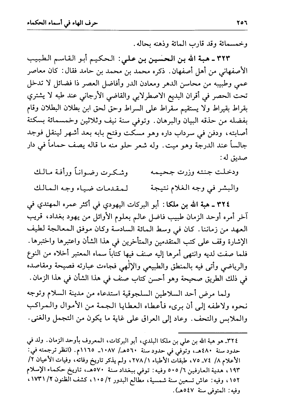 هبة الله بن ملكا أبو البركات اليهودي فِي أكثر عمره المهتدي فِي آخر أمره أَوْحد الزمان طبيب فاضل عالم بعلوم الأوائل من يهود بغداد قريب العهد من زماننا كَانَ فِي وسط المائة السادسة وَكَانَ موفق المعالجة لطيف الإشارة وقف عَلَى كتب المتقدمين والمتأخرين فِي هَذَا الشأن واعتبرها واختبرها فلما صفت لديه وانتهى أمرها إِلَيْهِ صنف فِيهَا كتاباً سماه المعتبر إخلاء من النوع والرياضي وأتى فِيهِ بالمنطق والطبيعي والإلهي فجاءت عبارته فصيحة ومقاصده فِي ذَلِكَ الطريق صحيحة وهو احسن كتاب صنف فِي هَذَا الشأن فِي هَذَا الزمان ولما مرض أحد السلاطين السلجوقية استدعاه من مدينة السلام وتوجه نحوه ولاطفه إِلَى أن برئ فأعطاه العطايا الجمة من الأموال والمراكب والملابس والتحق وعاد إِلَى العراق عَلَى غاية مَا يكون من التجمل والغنى