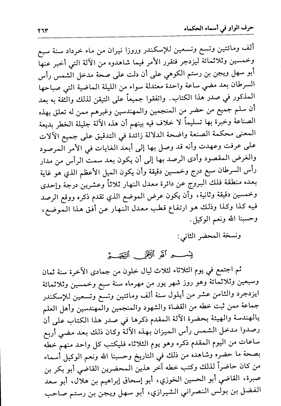 بسم الله الرحمن الرحيم .. ثُمَّ اجتمع فِي ثوم الثلاثاء لثلاث ليال خلون من جمادى الآخرة سنة ثمان وسبعين وثلاثمائة وهو روز سهريور من مهرماء سنة سبع وخمسين وثلاثمائة أيزدجرد والثامن عشر من أيلول سنة ألف ومائتين وتسع واسعين للإسكندر جماعة ممن ثبت خطه من القضاة والشهود المنجمين والمهندسين وأهل العلم بالهندسة والهيئة بحضرة الآلة المقدم ذكرها فِي صدر هَذَا الكتاب عَلَى أن رصدوا مدخل الشمس رأس الميزان بهذه الآلة وَكَانَ ذَلِكَ بعد مضي أربع ساعات من اليوم المقدم ذكره وهو يوم الثلاثاء فليكتب كل واحد منهم خطه بصحة مَا حضره وشاهده من ذَلِكَ فِي التاريخ وحسبنا الله ونعم الوكيل أسماء من كَانَ حاضراً لذلك وكتب خطه آخر هذين المحضرين القاضي أبو بكر بن صبر القاضي أبو الحسن الخوزي أبو إسحاق إبراهيم بن هلال أبو سعد الفضل بن بولس النصراني الشيرازي أبو سهل ويجن بن رستم صاحب