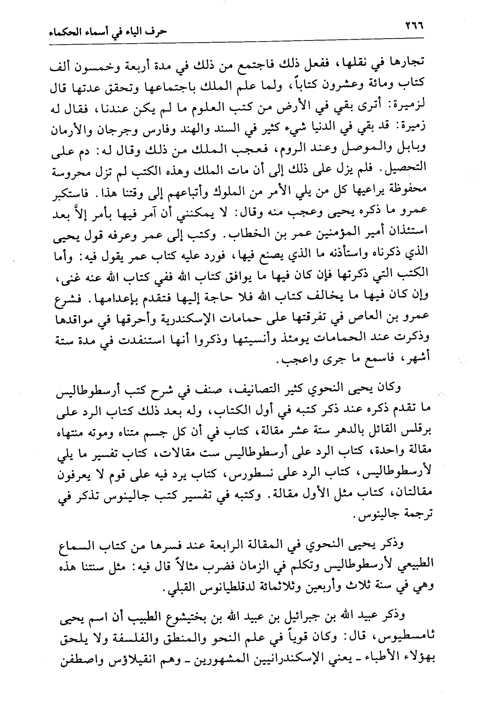 وَكَانَ يحيى النحوي كثير التصانيف صنف فِي شرح كتب أرسطوطالس مَا تقدم ذكره عند ذكر كتبه فِي أول الكتاب وَلَهُ بعد لَكَ. كتاب الرد عَلَى برقلس القائل بالدهر ستة عشر مقالة. كتاب فِي أن كل جسم متناه وموته منتهاه مقالة واحدة. كتاب الرد عَلَى أرسطوطاليس ست مقالات. كتاب تفسير مابل لأرسكوطاليس. كتاب الرد عَلَى نسطورس. كتاب يرد فِيهِ عَلَى قوم لا يعرفون مقالتان. كتاب مثل الأول مقالة وكتبه فِي تفسير كتب جالينوس تكر فِي ترجمة جالينوس .. وذكر يحيى النحوي فِي المقالة الرابعة عند فسرها من كتاب السماع الطبيعي لأرسطوطاليس وتكلم فِي الزمان فضرب مثالاً قال فِيهِ مثل سلتنا هَذِهِ وهي فِي سنة ثلاث وأربعين وثلاثمائة لدقلطيانوس القبطي.