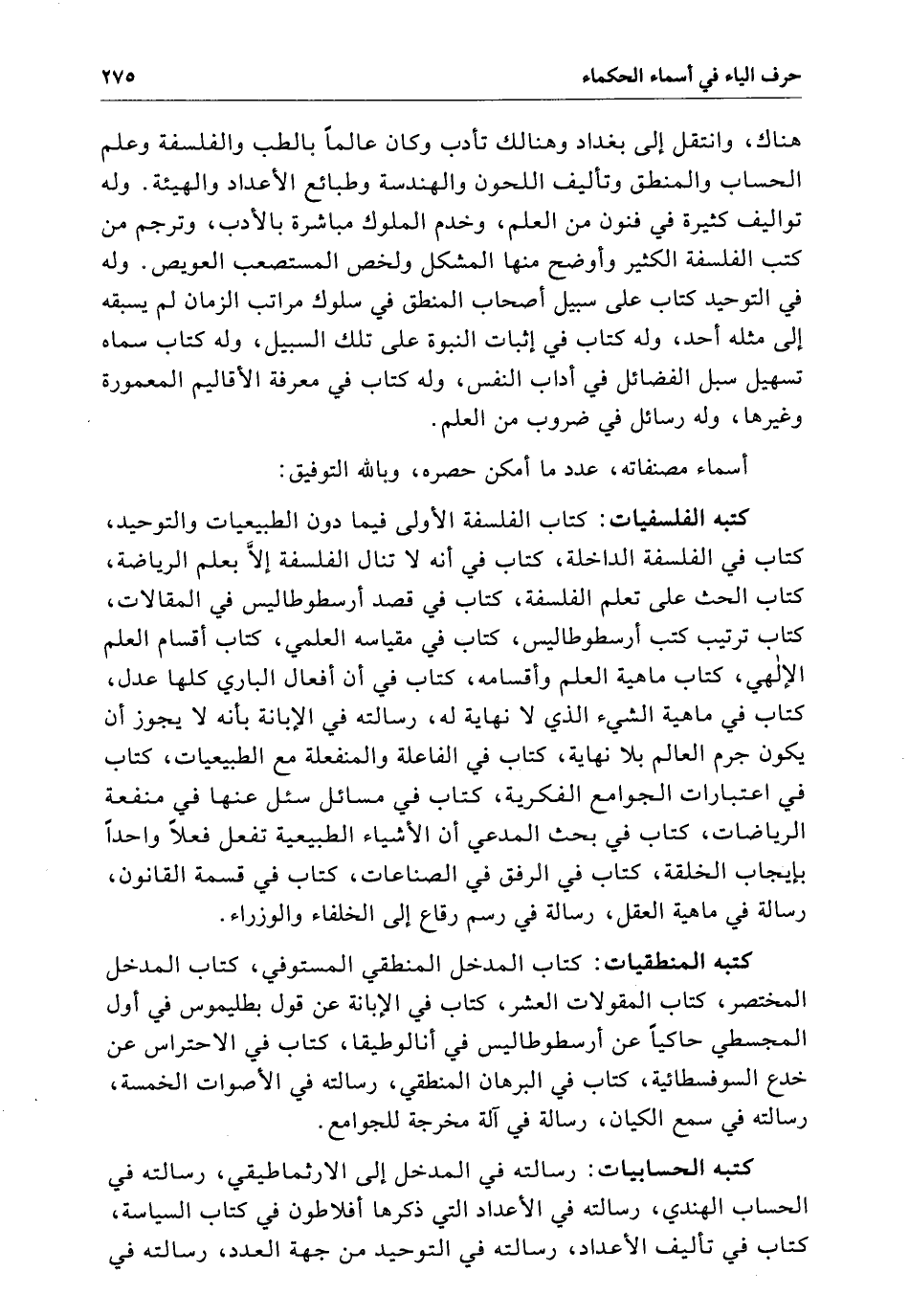 هناك وانتقل إِلَى بغداد وهنالك تأدب وَكَانَ عالماً بالطب والفلسفة وعلم الحساب والمنطق وتأليف اللحون والهندسة وطبائع الإعداد والهيئة وَلَهُ تواليف كثيرة فِي فنون من العلم وخدم الملوك مباشرة بالأدب وترجم من كتب الفلسفة الكثير وأوسح منها المشكل ولخص المستصعب العويص وَلَهُ فِي التوحيد. كتاب عَلَى سبيل أصحاب المنطق فِي سلوك مراتب الزمان لَمْ يسبقه إِلَى مثله أحد وَلَهُ. كتاب فِي إثبات النبوة عَلَى تِلْكَ السبيل وَلَهُ. كتاب سماه تسهيل سبل الفضائل فِي آداب النفس وَلَهُ. كتاب فِي معرفة الأقاليم المعمورة وغيرها وَلَهُ رسائل فِي ضروب من العلوم أسماء مصنفاته عدد مَا أمكن حصره وبالله التوفيق كتبه الفلسفيات. كتاب الفلسفة الأولى فيما دون الطبيعيات والتوحيد. كتاب فِي الفلسفة الداخلة. كتاب فِي أنه لا تنال الفلسفة إِلاَّ بعلم الرياضة. كتاب الحث عَلَى تعلم الفلسفة. كتاب فِي قصد أرسطوطاليس فِي المقالات. كتاب ترتيب كتب أرسطوطاليس. كتاب فِي مقياسه العلمي. كتاب أقسام العلم الإلهي. كتاب ماهية العلم وأقسامه. كتاب فِي أن أفعال الباري كلها عدل. كتاب فِي ماهية الشيء الَّذِي لا نهاية لَهُ. رسالة فِي الإبانة بأنه لا يجوز أن يكون جرم العالم بلا نهاية. كتاب فِي الفاعلة والمنفعلة مع الطبيعيات. كتاب فِي اعتبارات الجوامع الفكرية. كتاب فِي مسائل سئل عنها فِي منفعة الرياضات. كتاب فِي بحث المدعي أن الأشياء الطبيعية تفعل فعلاً واحداً بإيجاب الخلقة. كتاب فِي الرفق فِي الصناعات. كتاب فِي قسمة القانون. رسالة فِي ماهية العقل. رسالة فِي رسم رقاع إِلَى الخلفاء والوزراء.