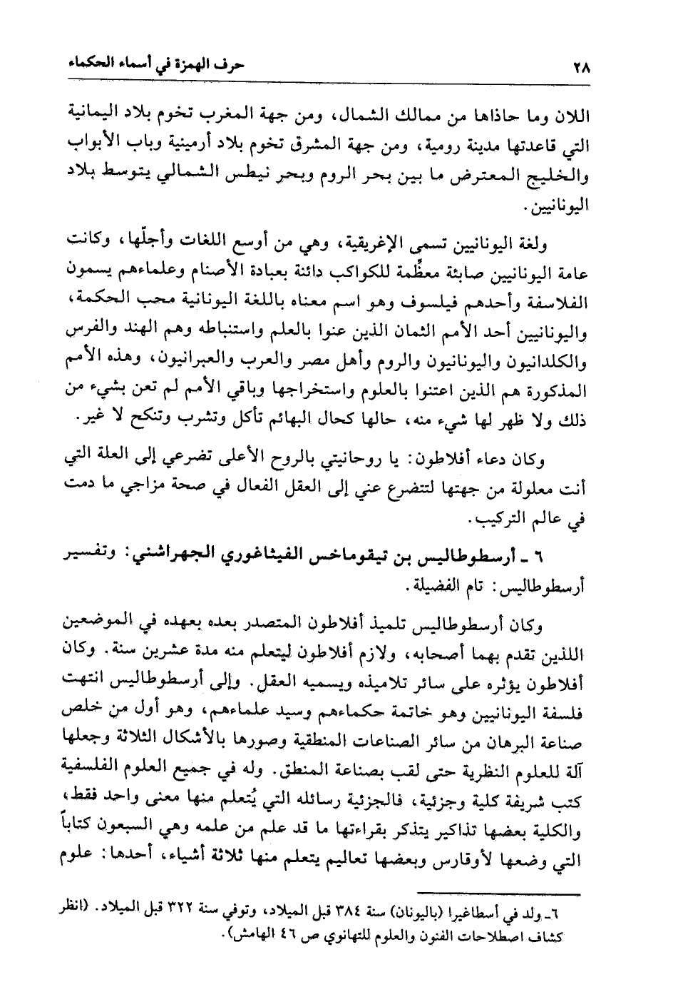 أرسطوطاليس بن نيقوماخس الفيثاغوري الجهراشني وتفسير أرسطوطاليس تام الفضيلة وَكَانَ أرسطوطاليس تلميذ أفلاطون المتصدر بعده بعهده فِي الموضعين اللذين تقدم بهما أصحابه ولازم أفلاطون ليتعلم منه مدة عشرين سنة وَكَانَ أفلاطون يؤثره عَلَى سائر تلاميذه ويسميه العقل وإلى أرسطوطاليس انتهت فلسفة اليونانيين وهو خاتمة حكماءهم وسيد علماءهم وهو أول من خلص صناعة البرهان من سائر الصناعات المنطقية وصورها بالأشكال الثلاثة وجعلها آلة للعلوم النظرية حَتَّى لقب بصناعة المنطق وَلَهُ فِي جميع العلوم الفلسفية كتب شريفة كلية وجزئية فالجزئية رسائله الَّتِي يُتعلم منها معنى واحد فقط والكلية بعضها تذاكير يتذكر بقراءتها مَا قَدْ علم من علمه وهي السبعون كتاباً الَّتِي وضعها لأوفارس وبعضها تعاليم يتعلم منها ثلاثة أشياء أحدها علوم