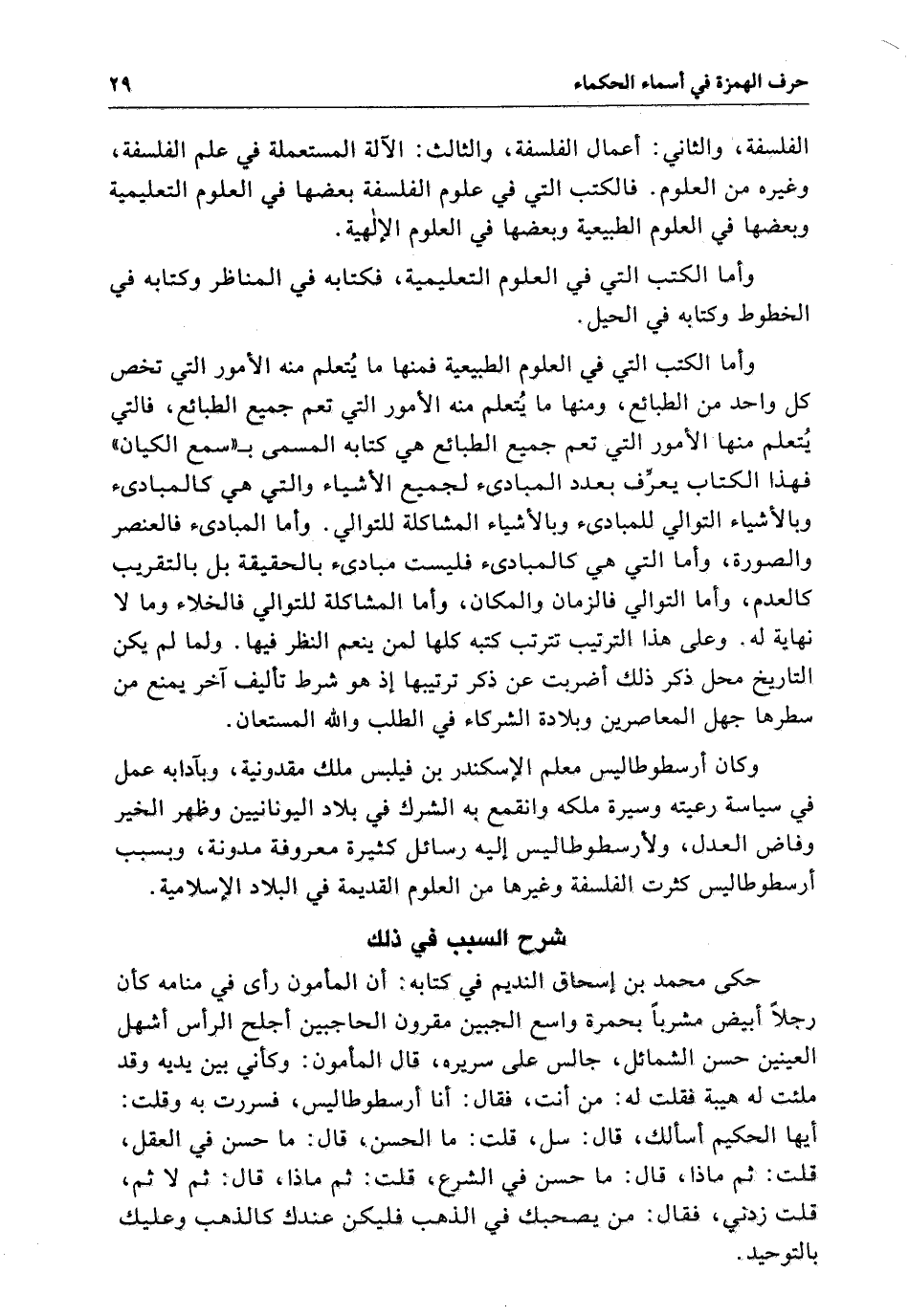 الفلسفة والثاني أعمال الفلسفة والثالث الآلة المستعملة فِي علم الفلسفة وغيره من العلوم فالكتب الَّتِي فِي علوم الفلسفة بعضها فِي العلوم التعليمية وبعضها فِي العلوم الطبيعية وبعضها فِي العلوم الإلهية وأما الكتب الَّتِي فِي العلوم التعليمية لكتابه فِي المناظر وكتابه فِي الخطوط وكتابه فِي الحيل وأما الكتب الَّتِي فِي العلوم الطبيعية فمنها مَا يُتعلم منه الأمور الَّتِي تخص كل واحد من الطبائع ومنها مَا يُتعلم منه الأمور الَّتِي تعم جميع الطبائع فالتي يُتعلم منها الأمور الَّتِي تعم جميع الطبائع هي كتابه المسمى بسمع الكيان فهذا الكتاب يعرّف بعدد المبادئ لجميع الأشياء والني هي كالمبادئ وبالأشياء التوالي للمبادئ المشاكلة للتوالي وأما المبادئ فالعنصر والصورة وأما الَّتِي هي كالمبادئ فليست مبادئ بالحقيقة بل بالتقريب كالعدم وأما التوالي فالزمان والمكان وأما المشاكلة للتوالي فالخلاء وَمَا لا نهاية لَهُ وَعَلَى هَذَا الترتيب تترتب كتبه كلها لمن ينعم النظر فِيهَا ولما لَمْ يكن التاريخ محل ذكر ذَلِكَ أضربت عن ذكر ترتيبها إذ هو شرط تأليف آخر يمنع من سطرها جهل المعاصرين وبلادة الشركاء فِي الطلب والله المستعان.