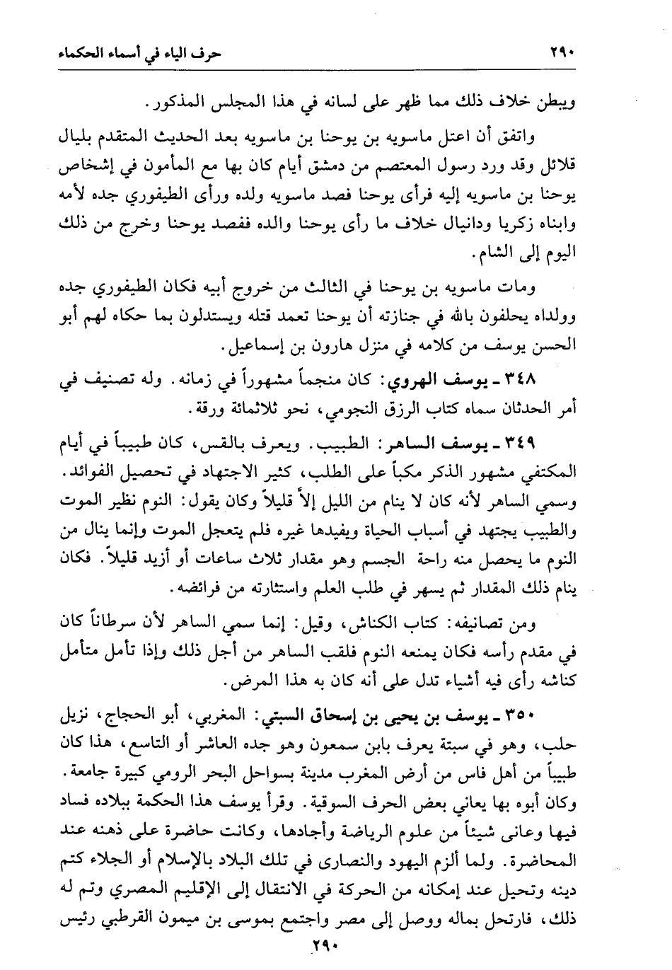 ويبطن خلاف ذَلِكَ مما ظهر عَلَى لسانه فِي هَذَا المجلس المذكور واتفق أن اعتل ماسويه بن يوحنا بن ماسويه بعد الحديث المتقدم بليال قلائل وَقَدْ ورد رسول المعتصم من دمشق أيام كَانَ بِهَا مع المأمون فِي أشخاص يوحنا بن ماسويه إليه فرأى يوحنا فصد ماسويه ولده ورأى الطيفوري جده لأمه وابناه زكريا ودانيال خلاف مَا رأى يوحنا والده ففصد يوحنا وخرج من ذَلِكَ اليوم إِلَى الشام ومات ماسويه بن يوحنا فِي الثالث من خروج أبيه فكان الطيفوري جده وولداه يحلفون بالله فِي جنازته أن يوحنا تعمد قتله ويستدلون بما حكاه لهم أبو الحسن يوسف من كلامه فِي منزل هارون بن إسماعيل.