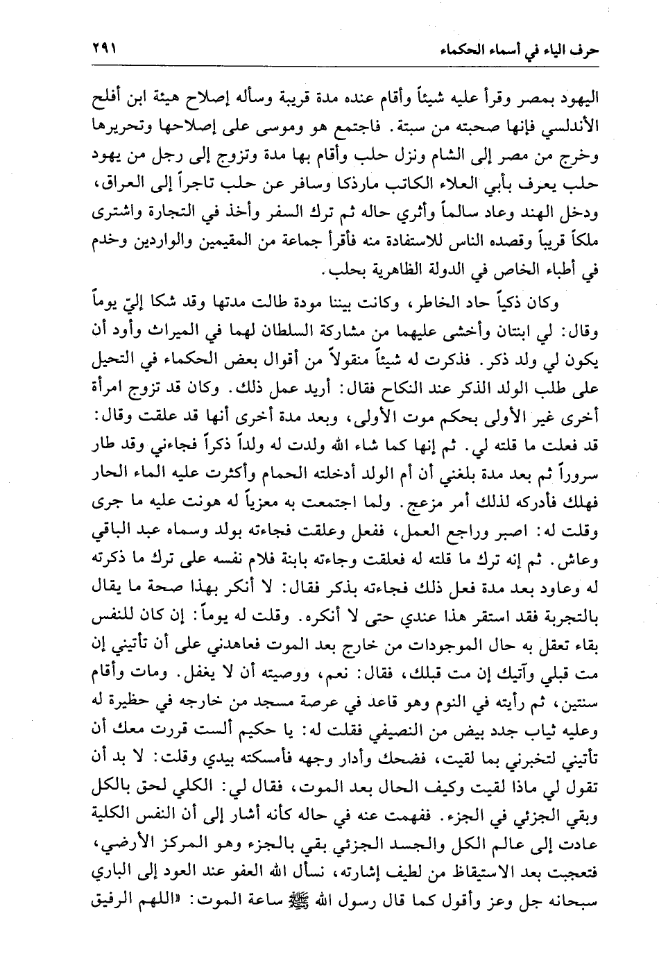 اليهود بمصر وقرأ عَلَيْهِ شيئاً وأقام عنده مدة قريبة وسأله إصلاح هيئة ابن أفلح الأندلسي فإنها صحبته من سبتة فاجتمع هو وموسى عَلَى إصلاحها وتحريرها وخرج من مصر إِلَى الشام ونزل حلب وأقام بِهَا مدة وتزوج إِلَى رجل من يهود حلب يعرف بأبي العلاء الكاتب مارذكاً وسافر عن حلب تاجراً إِلَى العراق ودخل الهند وعاد سالماً وأثرى حاله ثُمَّ ترك السفر وأخذ فِي البحارة واشترى ملكاً قريباً وقصده الناس للاستفادة منه فأقرأ جماعة من المقيمين والواردين وخدم فِي أطباء الخاص فِي الدولة الظاهرية بحلب وَكَانَ ذكياً حاد الخاطر وَكَانَتْ بيننا مودة طالت مدتها وَقَدْ شكا إليّ يوماً أمره وقال لي ابنتان وأخشى عليهما من مشاركة السلطان لهما فِي الميراث وأود أن يكون لي ولد ذكر فذكرت لَهُ شيئاً منقولاً من أقوال بعض الحكماء فِي التحيل عَلَى طلب الولد الذكر عند النكاح فقال أريد عمل ذَلِكَ وَكَانَ قَدْ تزوج امرأة أخرى غير الأولى بحكم موت الأولى وبعد مدة أخرى أنها قَدْ علقت وقال قَدْ فعلت مَا قلته لي ثُمَّ إنها كما شاء الله ولدت لَهُ ولداً ذكراً فجاءني وَقَدْ طار مسروراً ثُمَّ بعد ثُمَّ بعد مدة بلغني أن أم الولد أدخلته الحمام وأكثرت عَلَيْهِ الماء الحار فهلك فأدركه لذَلِكَ أمر مزعج ولما اجتمعت بِهِ معزياً لَهُ هونت عَلَيْهِ مَا جرى وقلت لَهُ اصبر وراجع العمل ففعل وعلقت فجاءته بولد وسماه عبد الباقي وعاش ثُمَّ إنه ترك مَا قلته لَهُ فعلقت وجاءته بابنة فلام نفسه عَلَى ترك مَا ذكرته لَهُ وعاود بعد مدة فعل ذَلِكَ فجاءته بذكر فقال لا أنكر بهذا صحة مَا يقال بالتجربة فقد استقر هَذَا عندي حَتَّى لا أنكره وقلت لَهُ يوماً إن كَانَ للنفس بفاء تعقل بِهِ حال الموجودات من خارج بعد الموت فعاهدني عَلَى أن تأتيني أن مت قبلي وأتيك أن مت قبلك فقال نعم ووصيته أن لا يغفل ومات أقام سنتين ثُمَّ رأيته فِي النوم وهو قاعد فِي عرصة مسجد من خارجه فِي حظيرة لَهُ وعليه ثياب جدد بيض من التصيفي فقلت لَهُ يَا حكيم ألست قررت معك أن تأتيني لتخبرني بما لقيت فضحك وأدار وجهه فأمسكته بيدي وقلت لا بن أن تقول لي مَاذَا لقيت وكيف الحال بعد الموت فقال لي الكلي لحق بالكل وبقي الجزئي فِي الجزء ففهمت عنه فِي حاله كأنه أشار إِلَى أن النفس الكلية عادت إِلَى عالم الكل والجسد الجزئي بقي بالجزء وهو المركز الأرضي فتعجبت بعد الاستيقاظ من لطيف إشارته نسأل الله العفو عند العود إِلَى الباري سبحانه جل وعز وأقول كما قال رسول الله صلى الله عليه وسلم ساعة الموت اللهم الرفيق