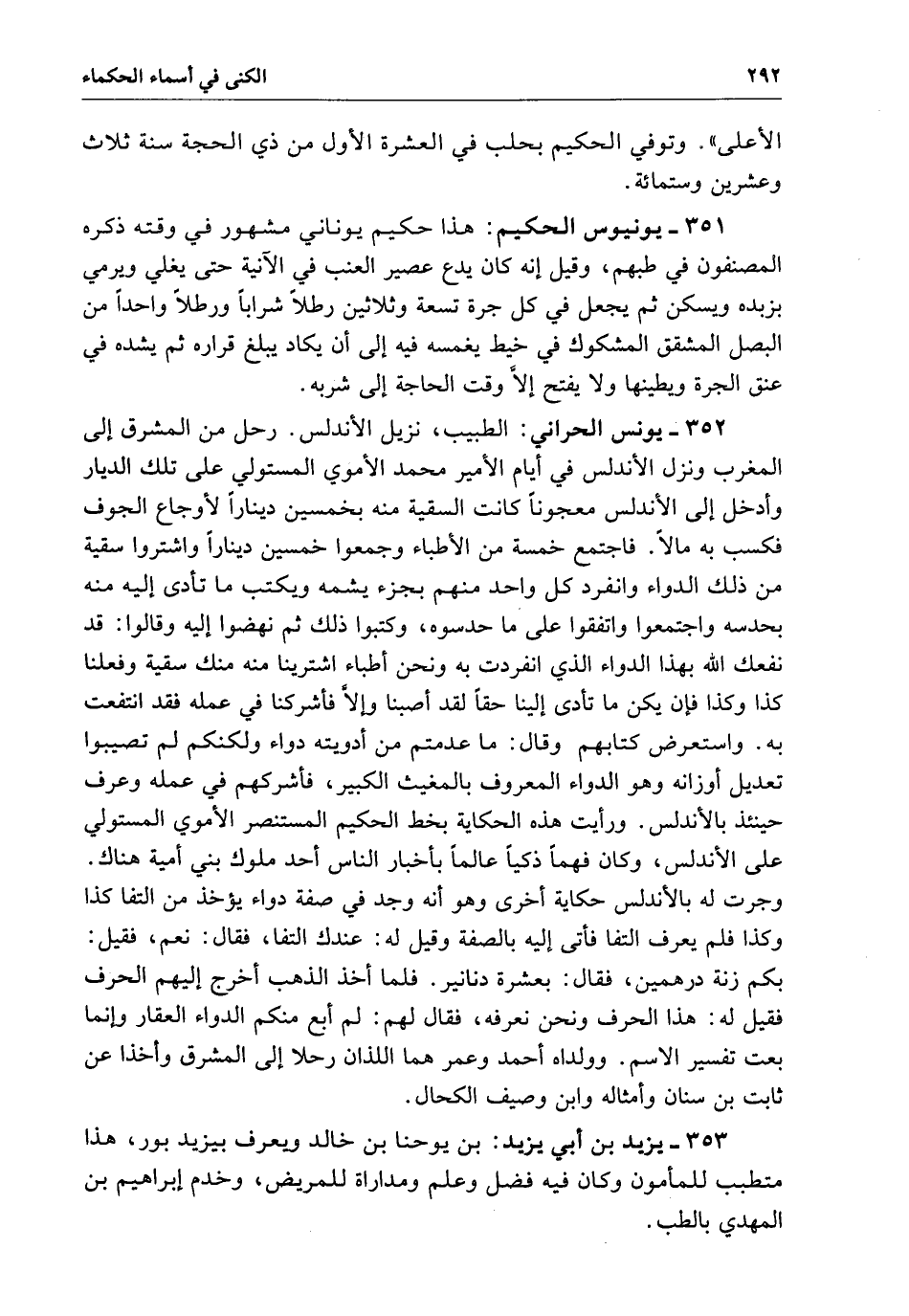 يونس الحراني الطبيب نزيل الأندلس رحل من المشرق إِلَى المغرب ونزل الأندلس فِي أيام الأمير محمد الأموي المستولي عَلَى تِلْكَ الديار وأدخل إِلَى الأندلس معجوناً كَانَتْ السقية منه بخمسين ديناراً لأوجاع الجوف فكسب بِهِ مالاً فاجتمع خمسة من الأطباء وجمعوا خمسين ديناراً واشتروا سقية من ذَلِكَ الدواء وانفرد كل واحد منهم بجزء يشمه ويكتب مَا تأدى إِلَيْهِ منه بحدسه واجتمعوا واتفقوا عَلَى مَا حد سوء وكتبوا ذَلِكَ ثُمَّ نهضوا إِلَيْهِ وقالوا نفعك الله بهذا الدواء الَّذِي انفردت بِهِ ونحن أطباء اشترينا منه منك سقية وفعلنا كذا وكذا فإن يكن مَا تأدى إلينا حقاً فقد أصبت وإلا فأشركنا فِي عمله فقد انتفعت بِهِ واستعرض كتابهم وقال مَا عدمتم من أدويته دواءاً ولكنكم لَمْ تصيبوا تعديل أوزانه وهو الدواء المعروف بالمغيث الكبير فأشركهم فِي عمله وعرف حينئذ بالأندلس ورأيت هَذِهِ الحكاية بخط الحكيم المستنصر الأموي المستولي عَلَى الأندلس وَكَانَ فهماً ذكياً عالماً بأخبار الناس أحد ملوك بني أمية هناك وجرت لَهُ بالأندلس حكاية أخرى وهو أنه وجد فِي صفة دواء يؤخذ من التفا كذا وكذا فلم يعرف النقا فأتي إِلَيْهِ بالصفة وقيل لَهُ عندك التفا فقال نعم فقيل بكم زنة درهمين فقال بعشرة دنانير فلما أخذ الذهب أخرج إليهم الحرف فقيل لَهُ هَذَا الحرف ونحن نعرفه فقال لهم لَمْ أبع منكم الدواء العقار وإنما بعت تفسير الاسم وولداه أحمد وعمر هما اللذان رحلا إِلَى المشرق وأخذا عن ثابت بن سنان وأمثاله وابن وصيف الكحال.