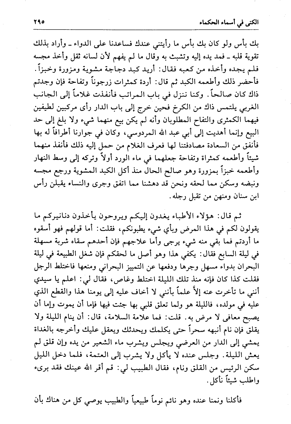 بك بأس ولو كَانَ بك بأس مَا رأيتني عندك فساعدنا عَلَى الدواء وأراد بذلك تقوية فلبه فمد يده إِلَيْهِ وتشبث بِهِ وقال مَا لَمْ يفهم لأن لسانه ثقل وأخذ مجسه فلم يجده وأخذه من كعبه فقال أريد كبد دجاجة مشوية ومزورة وخبزاً فأحضر ذَلِكَ وأطعمه الكبد ثُمَّ قال أردة كمثرات زرجوناً وتفاحة فإن وجدتم ذاك كَانَ صالحاً وكنا ننزل فِي باب المراتب فأنفذت غلاماً إِلَى الجانب الغربي يلتمس ذَاكَ من الكرخ فحين خرج إِلَى باب الدار رأى مركبين لطيفين فيهما الكمثرى والتفاح المطلوبان وأنه لَمْ يكن بيع منهما شيء ولا بلغ إِلَى حد البيع وإنما أهديت إِلَى أبي عبد الله المردوسي وَكَانَ فِي جوارنا أطرافاً لَهُ بِهَا فاتفق من السعادة مصادفتنا لَهَا فعرف الغلام من حمل إِلَيْهِ ذَلِكَ فأنفذ منهما شيئاً وأطعمه كمثراة وتفاحة جعلهما فِي مَاء الورد أولاً وتركه إِلَى وسط النهار وأطعمه خبزاً بمزورة وهو صالح الحال منذ أكل الكبد المشوية ورجع مجسه ونبضه وسكن مما لحقه ونحن قَدْ دهشنا مما اتفق وجري والنساء يقبلن رأس ابن سنان ومنهن من تقبل رجله ثُمَّ قال هؤلاء الأطباء يغدون إليكم ويروحون يأخذون دنانيركم مَا يقولون لكم فِي هَذَا المرض وبأي شيء يطبونكم فقلت أما قولهم فهو أسقوه مَا أردتم فما بقي منه شيء يرجى وأما علاجهم فإن أحدهم سقاه شربة مسهلة فِي ليلة السابع لقال
