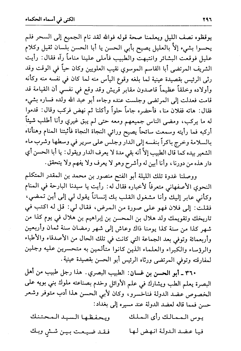 يوقظوه نصف الليل ويعلمنا صحة قوله فوالله لقد نام الجميع إِلَى السحر فلم يحسوا بشيء إِلاَّ بالعليل بأبي الحسن يَا أبا الحسن بلسان ثقيل وكلام عليل فوقعت البشائر وانتبهت والطبيب فأملى علينا مناماً رآه فقال رأيت الشريف المرتضي أبا القاسم الموسوي نقيب العلويين وَكَانَ حياً فِي الوقت وَقَدْ رثى الرئيس بقصيدة عينية لما بلغه وقوع اليأس منه لما كَانَ فِي نفسه منه وكأنه وأولاده وخلقاً عظيماً قاصدون مقابر قريش وَقَدْ وقع فِي نفسي أن القيامة قَدْ قامت فعدلت إِلَى المرتضى وجلست عنده وجاءه أبو عبد الله ولده فسارع بشيء فقال هاته ففلان منا فأحضره جاماً حلواً وأكلنا ثُمَّ نهض فركب وقال قدموا لَهُ مَا يركب ومضى الناس جميعهم ومعه حَتَّى لَمْ يبق غيري وأنا أطلب شيئاً أركبه فما رأيته وسمعت صائحاً يصيح ورائي النجاة النجاة فأثبتنا المنام وهنأناه بالسلامة وخرج باكراً بنفسه إلى الدار وجلس عَلَى سرير فِي وسطها وشرب ماء الشعير بيده كما قال الطبيب إِلاَّ أنه بقي مدة لا يعرف الدار ويقول يَا أيا الحسن أي دار هَذِهِ من دورنا وأنا أبين لَهُ وأشره وهو لا يعرف ولا يفهم ولا يتحقق وصلنا غدوة تِلْكَ الليلة أبو الفتح منصور بن محمد بن المقدر المتكلم النحوي الأصفهاني متعرفاً لأخباره فقال لَهُ رأيت يَا سيدنا البارحة فِي المنام وكأني عابراً إِلَيْكَ وأنا مشغول القلب بك إنساناً يقول لي إِلَى أَيْنَ تمضي فقلت إِلَى فلان فهو عَلَى صورة من المرض فقال لي قل لَهُ أكتب فِي تاريخك وتقويمك ولد هلال بن المحسن بن إبراهيم بن هلال فِي يوم كذا من شهر كذا من سنة كذا يومنا ذَاكَ وعاش إِلَى شهر رمضان سنة ثمان وأربعين وأربعمائة وتوفي بعد الجماعة الَّتِي كَانَتْ فِي تِلْكَ الحال من الأصدقاء والأطباء والرؤساء والكبراء والعلماء الذين كانوا متألمين متحسرين عَلَيْهِ وجلين لمفارقته وتوفي المرتضى ورثاه أبو الحسن بقصيدة عينية.