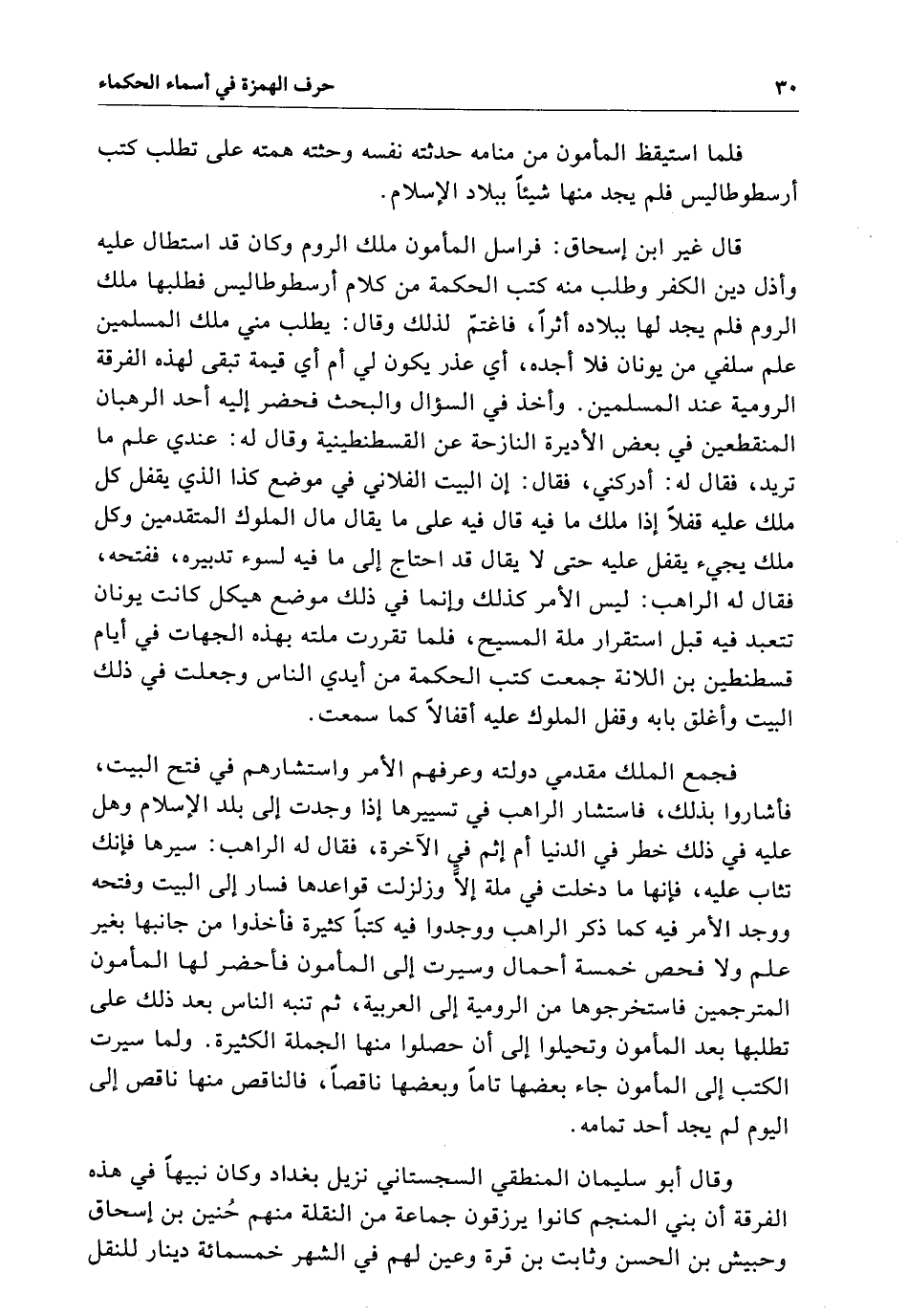 فلما استيقظ المأمون من منامه حدثته نفسه وحثته همته عَلَى تطلب كتب أرسطوطاليس فلم يجد منها شيئاً ببلاد الإسلام قال غير ابن إسحاق فراسل المأمون ملك الروم وَكَانَ قَدْ استطال عَلَيْهِ وأذل دين الكفر وطلب منه كتب الحكمة من كلام أرسطوطاليس فطلبها ملك الروم فلم يجد لَهَا ببلاده فاغتم لذلك وقال يطلب مني ملك المسلمين علم سلفي من يونان فلا أجده أي عذر يكون لي أم أي قيمة تبقى لهذه الفرقة الرومية عند المسلمين وأخذ فِي السؤال والبحث فحضر إِلَيْهِ أحد الرهبان المتقطعين فِي بعض الأديرة النازحة عن القسطنطينية وقال لَهُ عندي علم مَا تريد فقال لَهُ أدركني فقتال إِن البت الفلاني فِي موضع كذا الَّذِي يقفل كل ملك عَلَيْهِ قفلاً إِذَا ملك مَا فِيهِ عَلَى مَا يقال مال الملوك وكل ملك يجيء يقفل عَلَيْهِ حَتَّى لا يقال قَدْ احتاج إِلَى مَا فِيهِ لسوء تدبيره ففتحه فقال لَهُ الراهب لَيْسَ الأمر كذلك وإنما فِي ذَلِكَ الموضع هيكل كَانَتْ يونان تتعبد فِيهِ قبل استقرار ملة المسيح فلما تقررت ملته بهذه الجهات فِي أيام قسطنطين بت الثلاثة جمعت كتب الحكمة من أيدي الناس وجعلت فِي ذَلِكَ البيت وأغلق بابه وقفل الملوك عَلَيْهِ أقفالاً كما سمعت فجمع الملك مقدمي دولته وعرفهم الأمر واستشارهم فِي فتح البيت فأشاروا بذلك فاستشار الراهب فِي تسييرها إِذَا وجدت إِلَى بلد الإسلام وَعَلَى عَلَيْهِ فِي ذَلِكَ خطر فِي الدنيا أم إثم فِي الأخرى فقال لَهُ الراهب سيرها فإنك تثاب عَلَيْهِ فإنها مَا دخلت فِي ملة إِلاَّ وزلزلت قواعدها فسار إِلَى البيت وفتحه ووجد الأمر فِيهِ كما ذكر الراهب ووجدوا فِيهِ كتباً كثيرة فأخذوا من جانبها بغير علم ولا فحص خمسة أحمال وسيرت إِلَى المأمون فأحضر لَهَا المأمون المترجمين فاستخرجوها من الرومية إِلَى العربية ثُمَّ تنبه الناس بعد ذَلِكَ عَلَى تطلبها بعد المأمون وتحيلوا إِلَى أن حصلوا منها الجملة الكثيرة ولما سيرت الكتب إِلَى المأمون جاء بعضها تاماً وبعضها ناقصاً فالناقص منها ناقص إِلَى اليوم لَمْ يجد أحد تمامه وقال أبو سليمان المنطقي السجستاني نزيل بغداد وَكَانَ نبيهاً فِي هَذِهِ الفرقة أن بني المنجم كانوا يرزقون جماعة من النقلة منهم حُنين بن إسحاق وحبيش بن الحسن وثابت بن قرة وعيهم لهم فِي الشهر خمسمائة دينار لنقل