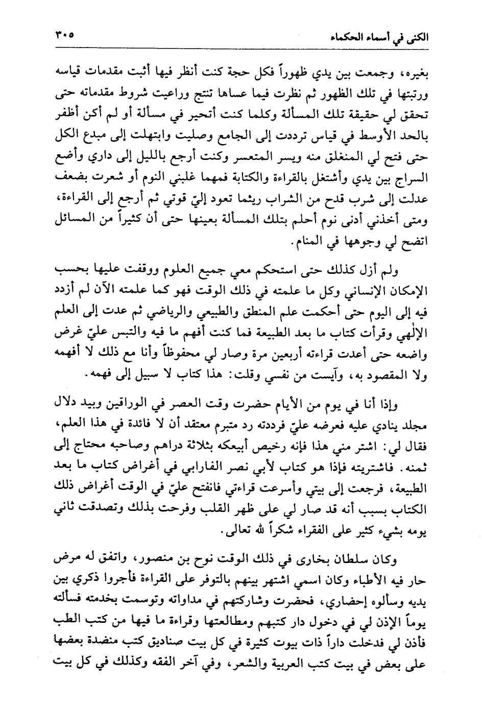 المقصود بِهِ وآيست من نفسي وقلت هَذَا كتاب لا سبيل إِلَى فهمه وإذا أنا فِي يوم من الأيام حضرت وقت العصر فِي الوراقين وبيد دلال مجلد ينادى عَلَيْهِ فعرضه عَلَى فردته رد متبرم معتقد أن لا فائدة فِي هَذَا العلم فقال لي اشتر مني هَذَا فإنه رخيص أبيعكه بثلاثة دراهم وصاحبه محتاج إِلَى ثمنه فاشتريته فإذا هو كتاب لأبي نصر الفارابي فِي أغراض كتاب مَا بعد الطبيعة فرجعت إِلَى بيتي وأسرعت قراءتي فانفتح علي فِي الوقت أغراض ذَلِكَ الكتاب بسبب أنه قَدْ صار لي عَلَى ظهر القلب وفرحت بذلك وتصدقت ثاني يومه بشيء كثير عَلَى الفقراء شكراً لله تعالى وَكَانَ سلطان بخاري فِي ذَلِكَ الوقت نوح بن منصور واتفق لَهُ مرض حار فِيهِ الأطباء وَكَانَ اسمي اشتهر بينهم بالتوفر عَلَى القراءة فأجروا ذكرى بَيْنَ يديه وسألوه إحضاري فحضرت وشاركتهم فِي مداواته وتوسمت بخدمته فسألته يوماً الإذن لي فِي دخول دار كتبهم ومطالعتها وقراءة مَا فِيهَا من كتب الطب فأذن لي فدخلت داراً ذات بيوت كثيرة فِي كل بيت صناديق كتب منضدة بعضها عَلَى بعض فِي بيت كتب العربية والشعر وَفِي آخر الفقه وكذلك فِي كل بيت كتب علم مفرد وطالعت فهرست كتب الأوائل وطلبت مَا احتجت إِلَيْهِ ورأت من الكتب مَا لا يقع اسمه إِلَى كثير من الناس قط ولا رأيته قط ولا رأيته أيضاً من بعد قرأت تِلْكَ الكتب وظهرت فوائدها وعرفت مرتبة كل رجل فِي علمه فلما بلغت ثمان عشرة سنة من عمري فرفعت من هَذِهِ العلوم كلها وكتب وكنت إذ ذَاكَ للعلم أحفظ ولكنه اليوم معي أنضج وإلا فالعلم واحد لَمْ يتجدد لي بعده شيء وَكَانَ فِي جواري رجل سيقال لَهُ أبو الحس الروضي فسألني أن أؤلف لَهُ كتاباً جامعاً فِي هَذَا العلم فصنفت لَهُ المجموع وسميته بِهِ وأتيت فِيهِ عَلَى سائر العلوم سوى الرياضي ولي إذ ذَاكَ إحدى وعشرون سنة من عمري وَكَانَ فِي جواري أيضاً رجل يقال لَهُ أبو بكر البرقي خوارزمي المولد فقيه النفس متوحد فِي الفقه والتفسير والزهد مائل إِلَى هَذِهِ العلوم فسألني شرح الكتب لَهُ فصنفت لَهُ. كتاب الحاصل والمحصول فِي قريب من عشرين مجلدة وصنفت لَهُ فِي الأخلاق كتاباً سميته. كتاب البر والإثم وهذان الكتابان لا يوجدان إِلاَّ عنده فلم يعرفهما أحد ينتسخ منهما ثُمَّ مات والدي وتصوفت فِي الأحوال وتقلدت شيئاً من أعمال السلطان ودعتني الضرورة إِلَى الارتحال عن بخارى والانتقال إِلَى كركاتج وَكَانَ أبو الحسين السهلي النحب لهذه العلوم بِهَا وزيراً وقدمت إِلَى الأمير بِهَا وهو عَلي بن المأمون وكنت عَلَى زي الفقهاء إذ ذَاكَ بطليسان وتحت الحك وأثبتوا إِلَى مشاهرة دارة تقوم بكفاية مثلي ثُمَّ دعت الضرورة إِلَى الانتقال إِلَى فسا ومنها إِلَى بارود ومنها إِلَى طوس ومنها إِلَى شقان ومنها إِلَى سمنقال ومنها إِلَى جاجرم رأس حد خراسان ومنها إِلَى جرجان وكل قصدي الأمير قابوس فاتفق فِي أثناء هَذَا أخذ قابوس وحبسه فِي بعض القلاع وموته هناك ثُمَّ مضيت إِلَى دهستان ومرضت بِهَا مرضاً صعباً وعدت إِلَى جرجان واتصل أبو عبيد الجوزجاني بي وأنشأت فِي حالي قصيدة فِيهَا بيت القائل: ود بِهِ وآيست من نفسي وقلت هَذَا كتاب لا سبيل إِلَى فهمه وإذا أنا فِي يوم من الأيام حضرت وقت العصر فِي الوراقين وبيد دلال مجلد ينادى عَلَيْهِ فعرضه عَلَى فردته رد متبرم معتقد أن لا فائدة فِي هَذَا العلم فقال لي اشتر مني هَذَا فإنه رخيص أبيعكه بثلاثة دراهم وصاحبه محتاج إِلَى ثمنه فاشتريته فإذا هو كتاب لأبي نصر الفارابي فِي أغراض كتاب مَا بعد الطبيعة فرجعت إِلَى بيتي وأسرعت قراءتي فانفتح علي فِي الوقت أغراض ذَلِكَ الكتاب بسبب أنه قَدْ صار لي عَلَى ظهر القلب وفرحت بذلك وتصدقت ثاني يومه بشيء كثير عَلَى الفقراء شكراً لله تعالى وَكَانَ سلطان بخاري فِي ذَلِكَ الوقت نوح بن منصور واتفق لَهُ مرض حار فِيهِ الأطباء وَكَانَ اسمي اشتهر بينهم بالتوفر عَلَى القراءة فأجروا ذكرى بَيْنَ يديه وسألوه إحضاري فحضرت وشاركتهم فِي مداواته وتو