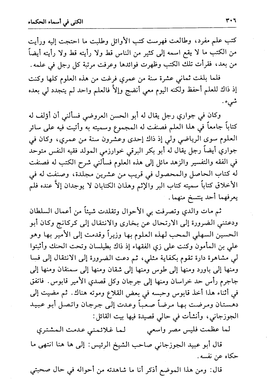 كتب علم مفرد وطالعت فهرست كتب الأوائل وطلبت مَا احتجت إِلَيْهِ ورأت من الكتب مَا لا يقع اسمه إِلَى كثير من الناس قط ولا رأيته قط ولا رأيته أيضاً من بعد قرأت تِلْكَ الكتب وظهرت فوائدها وعرفت مرتبة كل رجل فِي علمه فلما بلغت ثمان عشرة سنة من عمري فرفعت من هَذِهِ العلوم كلها وكتب وكنت إذ ذَاكَ للعلم أحفظ ولكنه اليوم معي أنضج وإلا فالعلم واحد لَمْ يتجدد لي بعده شيء وَكَانَ فِي جواري رجل سيقال لَهُ أبو الحس الروضي فسألني أن أؤلف لَهُ كتاباً جامعاً فِي هَذَا العلم فصنفت لَهُ المجموع وسميته بِهِ وأتيت فِيهِ عَلَى سائر العلوم سوى الرياضي ولي إذ ذَاكَ إحدى وعشرون سنة من عمري وَكَانَ فِي جواري أيضاً رجل يقال لَهُ أبو بكر البرقي خوارزمي المولد فقيه النفس متوحد فِي الفقه والتفسير والزهد مائل إِلَى هَذِهِ العلوم فسألني شرح الكتب لَهُ فصنفت لَهُ. كتاب الحاصل والمحصول فِي قريب من عشرين مجلدة وصنفت لَهُ فِي الأخلاق كتاباً سميته. كتاب البر والإثم وهذان الكتابان لا يوجدان إِلاَّ عنده فلم يعرفهما أحد ينتسخ منهما ثُمَّ مات والدي وتصوفت فِي الأحوال وتقلدت شيئاً من أعمال السلطان ودعتني الضرورة إِلَى الارتحال عن بخارى والانتقال إِلَى كركاتج وَكَانَ أبو الحسين السهلي النحب لهذه العلوم بِهَا وزيراً وقدمت إِلَى الأمير بِهَا وهو عَلي بن المأمون وكنت عَلَى زي الفقهاء إذ ذَاكَ بطليسان وتحت الحك وأثبتوا إِلَى مشاهرة دارة تقوم بكفاية مثلي ثُمَّ دعت الضرورة إِلَى الانتقال إِلَى فسا ومنها إِلَى بارود ومنها إِلَى طوس ومنها إِلَى شقان ومنها إِلَى سمنقال ومنها إِلَى جاجرم رأس حد خراسان ومنها إِلَى جرجان وكل قصدي الأمير قابوس فاتفق فِي أثناء هَذَا أخذ قابوس وحبسه فِي بعض القلاع وموته هناك ثُمَّ مضيت إِلَى دهستان ومرضت بِهَا مرضاً صعباً وعدت إِلَى جرجان واتصل أبو عبيد الجوزجاني بي وأنشأت فِي حالي قصيدة فِيهَا بيت القائل: