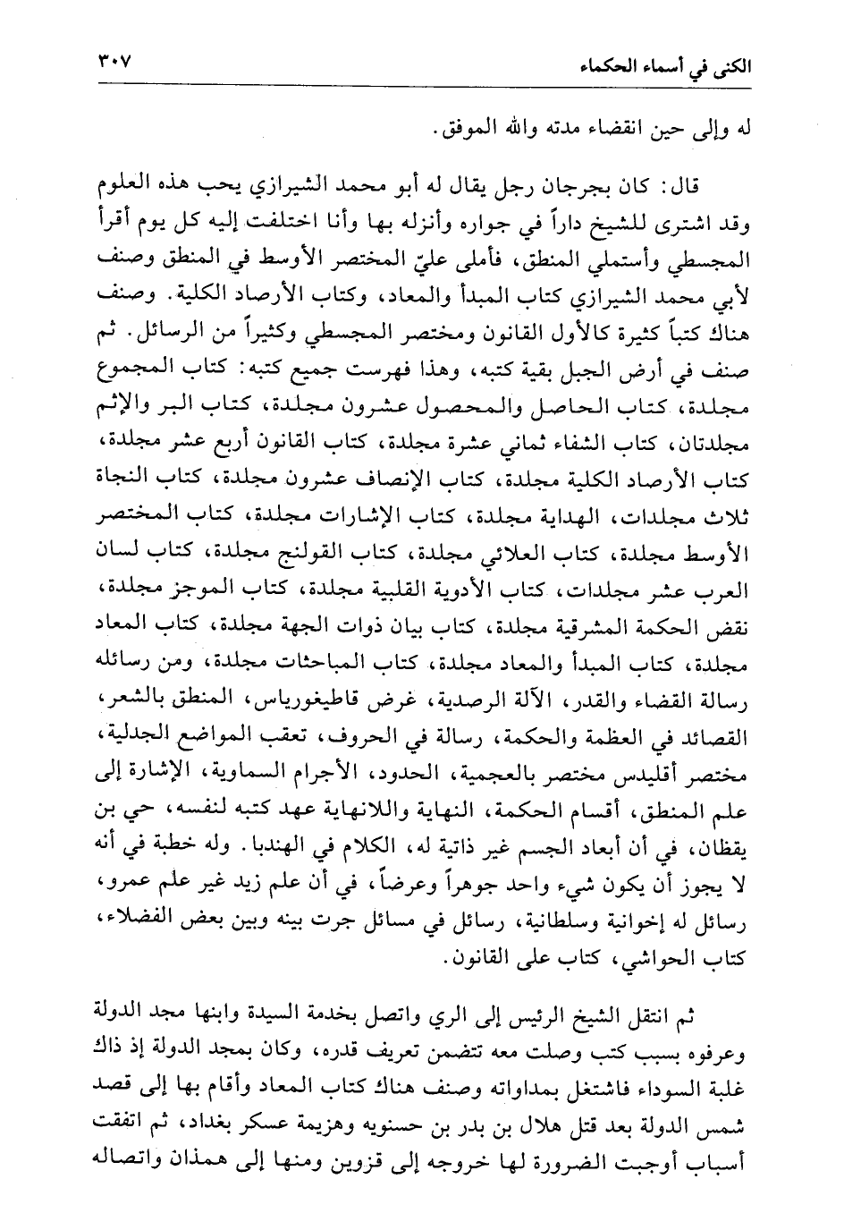 لَهُ وإلى حين انقضاء مدته والله الموفق قال كَانَ بجرجان رجل يقال لَهُ أبو محمد الشيرازي بحب هَذِهِ العلوم وَقَدْ اشترى للشيخ داراً فِي جواره وأنزله بِهَا وأنا أختلف إِلَيْهِ كل يوم أقرأ المجسطي وأستملي المنطق فأملي عَلَى المختصر الأوسط فِي المنطق وصنف لأبي محمد الشيرازي. كتاب المبدأ والمعاد. وكتاب الأرصاد الكلية وصنف هناك كتباً كثيرة كالأول القانون ومختصر المجسطي وكثيراً من الرسائل ثُمَّ صنف فِي أرض الجبل بقية كتبه وهذا فهرست جميع كتبه. كتاب المجموع مجلدة. كتاب الحاصل والمحصول عشرون مجلدة. كتاب البر والإثم مجلدتان. كتاب الشفاء ثماني عشرة مجلدة. كتاب القانون أربع عشر مجلدة. كتاب الأرصاد الكلية مجلدة. كتاب الإنصاف عشرون مجلدة. كتاب النجاة ثلاث مجلدات. الهداية مجلدة. كتاب الإشارات مجلدة. كتاب المختصر الأوسط مجلدة. كتاب العلائي مجلدة. كتاب القولنج مجلدة. كتاب لسان العرب عشر مجلدات. كتاب الأدوية القلبية مجلدة. كتاب الموجز مجلدة. نقض الحكمة المشرقية مجلدة. كتاب بيان ذوات الجهة مجلدة. كتاب المعاد مجلدة. كتاب المبدأ والمعاد مجلدة. كتاب المباحثات مجلدة. ومن رسائله رسالة القضاء والقدر. الآلة الرصدية. غرض قاطيغورياس. المنطق بالشعر. القضاء فِي العظمة والحكمة. رسالة فِي الحروف. تعقب المواضع الجدلية. مختصر إقليدس مختصر بالعجمية. الحدود. الأجرام السماوية. الإشارة إِلَى علم المنطق. أقسام الحكمة. النهاية واللانهاية عهد كتبه لنفسه محيي بن يقظان. فِي أن أبعاد الجسم غير ذاتية لَهُ. الكلام فِي الهندبا. وَلَهُ خطبة فِي أنه لا يجوز أن يكون شيء واحد جوهراً وعرضاً فِي أن علم زيد غير علم عمرو. رسائل لَهُ إخوانية وسلطانية. رسائل فِي مسائل جرت بينه وبين بعض الفضلاء. كتاب الحواشي. كتاب عَلَى القانون ثُمَّ انتقل الشيخ الرئيس إِلَى الري واتصل بخدمة السيدة وابنها مجد الدولة وعرفوه بسبب كتب وصلت معه تتضمن تعريف قدره وَكَانَ يمجد الدولة إذ ذَاكَ غلبة السوداء فاشتغل بمداواته ونف هناك كتاب المعاد وأقام بِهَا إِلَى قصد شمس الدولة بعد قتل هلال بن بدر بن حسنويه وهزيمة عسكر بغداد ثُمَّ اتفقت أسباب أوجبت الضرورة لَهَا خروجه إِلَى قزوين ومنها إِلَى همذان واتصاله