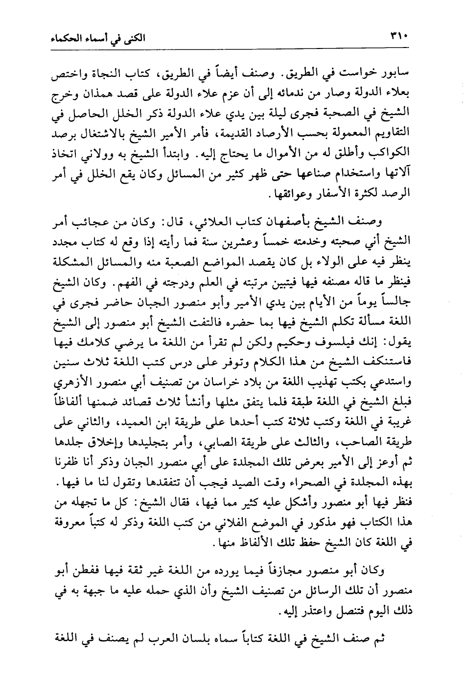 سابور خواست فِي الطريق وصنف أيضاً فِي الطريق. كتاب النجاة واختص بعلاء الدولة وصار من ندمائه إِلَى أن عزم علاء الدولة عَلَى قصد همذان وخرج الشيخ فِي الصحبة فجرى ليلة بَيْنَ يدي علاء الدولة ذكر الخلل الحاصل فِي التقاويم المعمولة بحسب الأرصاد القديمة فأمر الأمير الشيخ بالاشتغال برصد الكواكب وأطلق لَهُ من الأموال مَا يحتاج إِلَيْهِ وابتدأ الشيخ بِهِ وولاني اتخاذ آلاتها واستخدام صناعها حَتَّى ظهر كثير من المسائل وَكَانَ يقع الخلل فِي أمر الرصد لكثرة الأسفار وعوائقها وصنف الشيخ بأصفهان. كتاب العلائي قال وَكَانَ من عجائب أمر الشيخ أني صحبته وخدمته خمساً وعشرين سنة فما رأيته إِذَا وقع لَهُ كتاب مجدد ينظر فه عَلَى الولاء بل كَانَ يقصد المواضع الصعبة منه والمسائل المشكلة فينظر مَا قاله مصنفه فِيهَا فيتبين مرتبته فِي العلم ودرجته فِي الفهم وَكَانَ الشيخ جالساً يوماً من الأيام بَيْنَ يدي الأمير وأبو منصور الجبان حاضر فجرى فِي اللغة مسألة تكلم الشيخ فِيهَا بما حضره فالتفت الشيخ أبو منصور إِلَى الشيخ يقول إنك فيلسوف وحكيم ولكن لَمْ تقرأ من اللغة مَا رضي كلامك فِيهَا فاستنكف الشيخ من هَذَا الكلام وتوفر عَلَى درس كتب اللغة ثلاث سنين واستدعي بكتب تهذيب اللغة من بلاد خراسان من تصنيف أبي منصور الأزهري فبلغ الشيخ فِي اللغة طبقة فلما يتفق مثلها وأنشأ ثلاث قصائد ضمنها ألفاظاً غريبة فِي اللغة وكتب ثلاثة كتب أحدها عَلَى طريقة ابن العميد والثاني عَلَى طريقة الصاحب والثالث عَلَى طريقة الصابي وأمر بتجليدها وأخلاق جلدها ثُمَّ أوعز إِلَى الأمير بعرض تِلْكَ المجلدة عَلَى أبي منصور الجبان وذكر أنا ظفرنا بهذه المجلدة فِي الصحراء وقت الصيد فيجب أن تتفقدها وتقول لَنَا مَا فِيهَا أبو منصور وأشكل عَلَيْهِ كثير مما فِيهَا فقال الشيخ كل مَا تجهله من هَذَا الكتاب فهو مذكور فِي الموضع الفلاني من كتب اللغة وذكر لَهُ كتباً معروفة فِي اللغة كَانَ الشيخ حفظ تِلْكَ الألفاظ منها وَكَانَ أبو منصور مجازفاً فيما يورده من اللغة غير ثقة فِيهَا ففطن أبو منصور أن تِلْكَ الرسائل من تصنيف الشيخ وأن الَّذِي حمله عَلَيْهِ مَا جبهه بِهِ فِي ذَلِكَ اليوم فتنصل واعتذر إِلَيْهِ ثُمَّ صنف الشيخ فِي اللغة كتاباً سماه بلسان العرب لَمْ يصنف فِي اللغة
