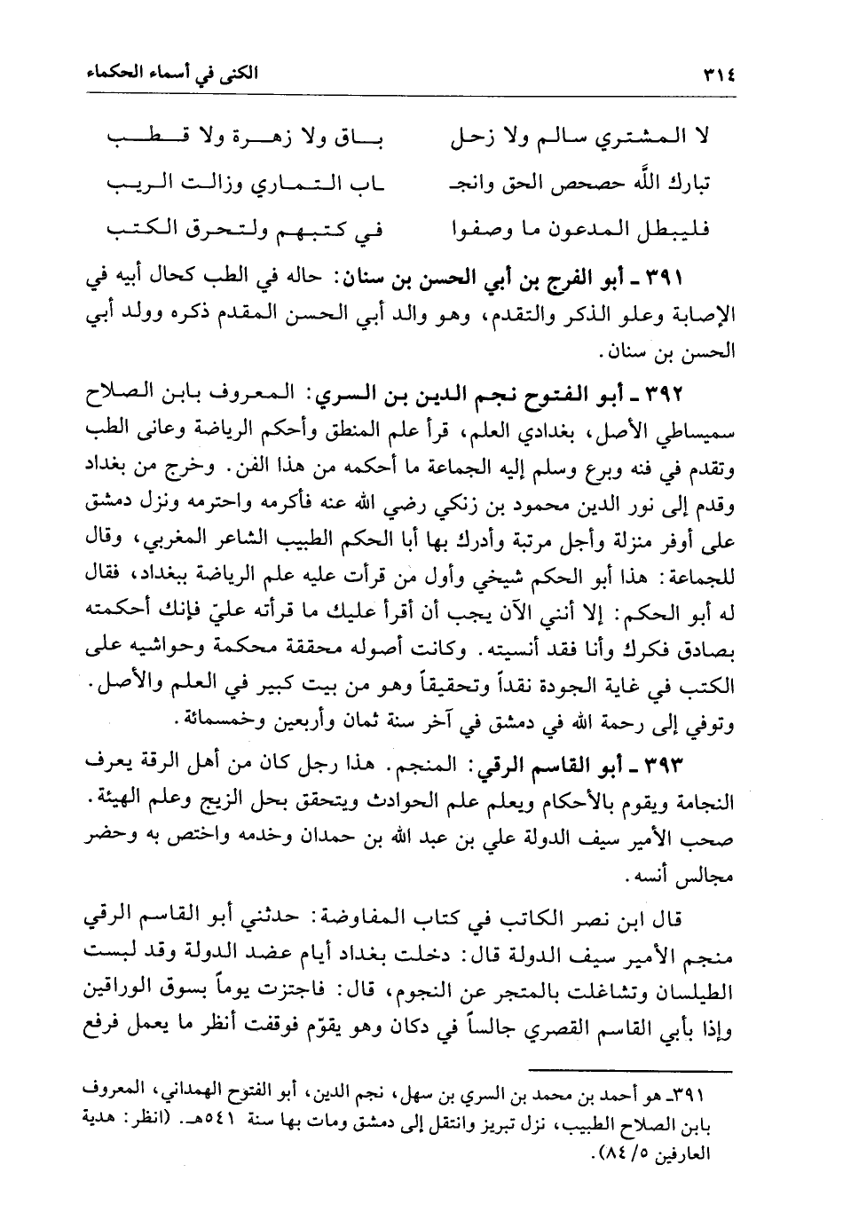 أبو الفتوج نجم الدين بن السري المعروف بابن الصلاح سميساطي الأصل بغدادي العلم قرأ علم المنطق وأحكم الرياضة وعاتي الطب وتقدم فِي فنه وبرع وسلم إِلَيْهِ الجماعة مَا أحكمه من هَذَا الفن وخرج من بغداد وقدم إِلَى نور الدين محمود بن زنكي رضي الله عنه فأكرمه واحترمه ونزل دمشق عَلَى أوفر منزلة وأجل مرتبة وأدرك بِهَا أبا الحكم الطبيب الشاعر المغربي وقال للجماعة هَذَا أبو الحكم شيخي وأول من قرأت عَلَيْهِ علم الرياضة ببغداد فقال لَهُ أبو الحكم ألا إنني الآن يجب أن أقرأ عليم مَا قرأته علي فإنك أحكمته بصادق فكرك وأنا فقد أنسته وَكَانَتْ أصوله محققة محكمة وحواشيه عَلَى الكتب فِي غاية الجودة تقداً وتحقيقاً وهو من بيت كبير فِي العلم والأصل وتوفي إِلَى رحمة الله فِي دمشق فِي آخر سنة ثمان وأربعين وخمسمائة.