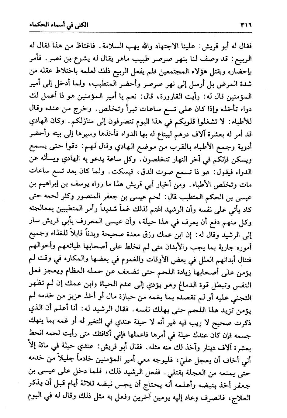 فقال لَهُ أبو قريش علينا الاجتهاد والله يهب السلامة فاغتاظ من هَذَا فقال لَهُ الربيع قَدْ وصف لنا بنهر صرصر طبيب ماهر يقال لَهُ يشوع بن نصر فأمر بإحضاره وبفتل هؤلاء المجتمعين فلم يفعل الربيع ذَلِكَ لعلمه باختلاط عقله من شدة المرض بل أرسل إِلَى نهر صرصر وأحضر المتكبب ولما أدخل إِلَى أمير المؤمنين قال لَهُ رأيت القارورة قال نعم يَا أمير المؤمنين هو ذا أعمل لَكَ دواء تأخذه وإذا كَانَ عَلَى تسع ساعات تبرأ وتخلص وخرج من عنده وقال للأطباء لا تشغلوا قلوبكم فِي هَذَا اليوم تنصرفون إِلَى منازلكم وَكَانَ الهادي قَدْ أمر لَهُ بعشرة آلاف درهم لبتاع لَهُ بِهَا الدواء فأخذها وسيرها إِلَى بيته وأحضر أدوية وجمع الأطباء بالقرب من موضع الهادي وقال لهم دقوا حَتَّى يسمع ويسكن فإنكم فِي آخر النهار تتخلصون وكل ساعة يدعو بِهِ الهادي ويسأله عن الدواء فيقول هو ذا تسمع صوت الدق فيسكت ولما كَانَ بعد تسع ساعات مات وتخلص الأطباء .. ومن أخبار أبي قريش هَذَا مَا رواه يوسف بن إبراهيم ابن عيسى بن الحكم المتطبب قال لحم عيسى بن جعفر المنصور وكثر لحمه حَتَّى كاد يأتي عَلَى نفسه وأن الرشيد اغتم لذلك غماً شديداً وأمر المتطببين بمعالجته وكل منهم دفه أن يعرف فِي هَذَا حيلة وأن عيسى المعروف بأبي قريش سار إِلَى الرشيد وقال هل أن ابن عمك رزق معدة صحيحة وبدناً قابلاً للغذاء وجميع أموره جارية بما يحب والأبدان متى لَمْ تخلط عَلَى أصحابها طبائعهم وأحوالهم فتنال أبدانهم العلل فِي بعض الأوقات والغموم فِي بعضها والمكاره فِي وقت لَمْ يؤمن عَلَى أصحابها زيادة اللحم حَتَّى تضعف عن حمله العظام ويعجز فعل النفس وتبطل قوة الدماغ وهو يؤدي إِلَى عدم الحياة وابن عمك إن لَمْ تظهر التجني عَلَيْهِ أَوْ لَمْ تقصده بما يغمه من حيازة مال أَوْ أخذ عزيز من خدمه لَمْ يؤمن تزيد هَذَا اللحم حَتَّى يهلك نفسه فقال الرشيد لَهُ أنا أعلم أن الَّذِي ذكرت صحيح لا ريب فِيهِ غير أنه لا حيلة عندي فِي التغير لَهُ أَوْ غمه بما ينهك جسمه فإن كَانَتْ عندك حيلة فِي أمرها فاعملها فإني أكافئك متى رأيت لحمه انحط بعشرة آلاف دينار وآخذ لَكَ منه مثله فقال أبو قريش عندي حيلة فِي مائة إِلاَّ أني أخاف أن يعجل علي فليوجه معي أمير المؤمنين خادماً جليلاً من خدمه حَتَّى يمنعه من العجلة بقتلي ففعل الرشيد ذَلِكَ فلما دخل عَلَى عيسى