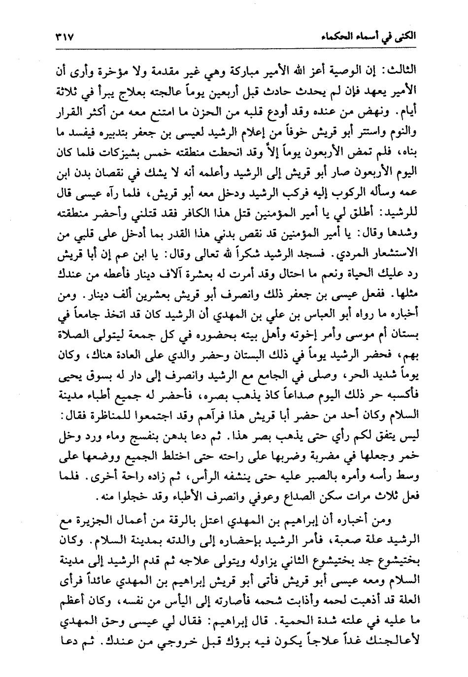 الثالث أن الوصية أعز الله الأمير مباركة وهي غير مقدمة ولا مؤخرة وأرى أن الأمير يعهد فإن لَمْ يحدث حادث قبل أربعين يوماً عالجته بعلاج يبرأ فِي ثلاثة أيام ونهض من عنده وَقَدْ أودع قلبه من الحزن مَا امتنع معه من أكثر القرار والنوم واستتر أبو قريش خوفاً من إعلام الرشيد لعيسى بن جعفر بتدبيره فيفسد مَا بناه فلم تمض الأربعون يوماً إِلاَّ وَقَدْ انحطت منطقته خمس بشيزكان فلما كَانَ اليوم الأربعون صار أبو قريش إِلَى الرشيد وأعلمه أنه لا يشك فِي نقصان بدن ابن عمه وسأله الركوب إِلَيْهِ فركب الرشيد ودخل معه أبو قريش فلما رآه عيسى قال للرشيد أطلق لي يَا أمير المؤمنين قتل هَذَا الكافر فقد قتلني وأحضر منطقته وشدها وقال يَا أمير المؤمنين قَدْ نقص بدني هَذَا القدر بما أدخل عَلَى قلبي من الاستشعار المردي فسجد الرشيد شكراً لله تعالى وقال يَا بن عن إن أبا قريش رد عَلَيْكَ الحياة ونعم مَا احتال وَقَدْ أمرت لَهُ بعشرة آلاف دينار فأعطه من عندك مثلها ففعل عيسى بن جعفر ذَلِكَ وانصرف أبو قريش بعشرين ألف دينار .. ومن اخباره مَا رواه العباس بن علي بن المهدي أن الرشيد كَانَ قَدْ اتخذ جامعاً فِي بستان أم موسى وأمر إخوته وأهل بيته بحضوره فِي كل جمعة ليتولى الصلاة بهم فحضر الرشيد يوماً فِي ذَلِكَ البستان وحضر والدي عَلَى العادة هناك وَكَانَ يوماً شديد الحر وصلى فِي الجامع مع الرشيد وانصرف إِلَى دار لَهُ بسوق يحيى فأكسبه حر ذَلِكَ اليوم صداعاً كاد يذهب بصره فأحضر لَهُ جميع أطباء مدينة السلام وكان أحد من حضر أبا قريش هَذَا فرآهم وَقَدْ اجتمعوا للمناظرة فقال لَيْسَ يتفق لكم رأي حَتَّى يذهب بصر هَذَا ثُمَّ دعا بدهن بنفسج وماء ورد وخل خمر وجعلها فِي مضربة وضربها عَلَى راحته حَتَّى اختلط الجميع ووضعها عَلَى وسط رأسه وأمره بالصبر عَلَيْهِ حَتَّى ينشفه الرأس ثُمَّ زاده راحة أخرى فلما فعل ذَلِكَ ثلاث مرات سكن الصداع وعوفي وانصرف الأطباء وَقَدْ خجلوا منه .. ومن أخباره أن إبراهيم بن المهدي اعتل بالرقة من أعمال الجزيرة مع الرشيد علة صعبة فأمر الرشيد بإحضاره إِلَى والدته بمدينة السلام وَكَانَ بختيشوع حد بختيشوع الثاني يزاوله ويتولى علاجه ثُمَّ قدم الرشيد إِلَى مدينة السلام ومعه عيسى أبو قريش فأتي أبو قريش بن المهدي عائداً فرأى العلة قَدْ أذهبت لحمه وإذا ذابت شحمه فأصارته إِلَى اليأس من نفسه وَكَانَ أعظم مَا عَلَيْهِ فِي علته شدة الحمية قال إبراهيم فقال لي عيسى وحق المهدي لأعالجنك غداً علاجاً يكون فِيهِ برؤك قبل خروجي من عندك ثُمَّ دعا