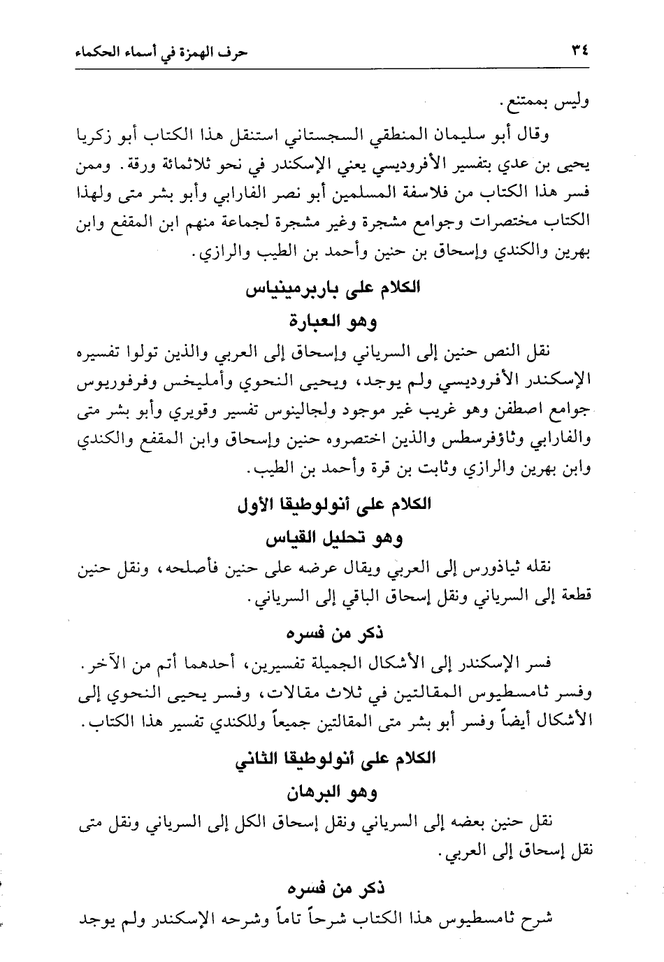 وَلَيْسَ بممتنع وقال أبو سليمان المنطقي السجستاني استقل هَذَا الكتاب أبو زكريا يحيى ابن عدي بتفسير القروديسيّ يعني الإسكندر فِي نحو ثلاثمائة ورقة وممن فسر هَذَا الكتاب من فلاسفة المسلمين أبو نصر الفارابي وأبو بشر متى ولهذا الكتاب مختصرات وجوامع مشجرة وغير مشجرة لجماعة منهم ابن المقفع وابن بهرين والكندي وإسحاق بن حنين وأحمد بن الطيب والرازي.