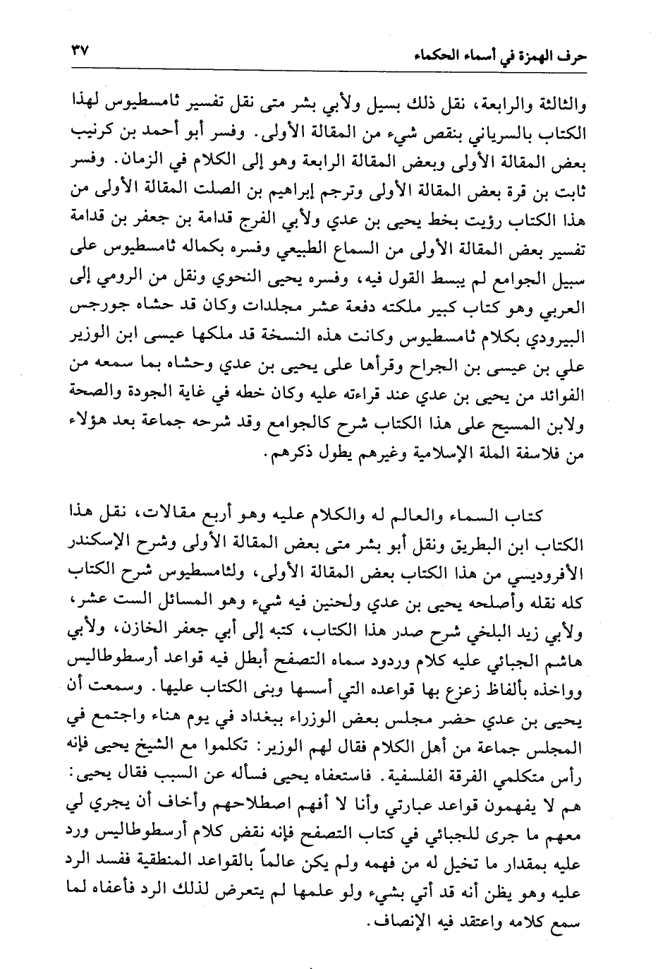 كتاب السماع الطبيعي وهو المعروف يسمع الكيان وهو ثماني مقالات الموجود من تفسير الإسكندر الأفروديسي لهذا الكتاب المقالة الأولى من نص كلام أرسطوطاليس فِي مقالتين والموجود منهما مقالة وبعض الأخرى ونقلها أبو روح الصابي وأصلح هَذَا النقل يحيى بن عدي والمقالة الثانية من نص كلام أرسطوطاليس ف مقالة واحدة ونقلها من اليوناني إِلَى السرياني حنين ونقلها من السرياني إِلَى العربي يحيى بن عدي وَلَمْ يوجد شرح المقالة الثالثة من نص كلام أرسطوطاليس فأما المقالة الرابعة ففسرها فِي ثلاث مقالات والموجود منها المقالة الأولى والثانية وبعض الثالثة إِلَى الكلام فِي الزمان ونقل ذَلِكَ قسطاً والظاهر الموجود ونقل الدمشقي والمقالة الخامسة من كلام أرسطوطاليس فِي مقالة واحدة نقلها قسطا بن لوقا والمقالة السادسة فِي مقالة واحدة والموجود منها النصف وأكثر قليلاً والمقالة السابعة فِي مقالة واحدة ترجمة قسطا والمقالة الثامنة فِي مقالة واحدة والموجود منها أوراق يسيرة فأما ترجمة قسطا من هَذَا الكتاب فهي تعاليم وَمَا ترجمه عبد المسيح بن ناعمة فهو غير تعاليم والذي ترجمه قسطا النصف الأول وهو أربع مقالات والنصف الآخر وهو أيضاً أربع مقالات ترجمه ابن ناعمة فأما من فسره فجماعة من فلاسفة متفرقين يوجد تفسير فرفوريوس للأولى والثانية والثالثة والرابعة نقل ذَلِكَ بسيل ولأبي بشر متى نقل تفسير ثامسطيوس لهذا الكتاب بالسرياني يتقص شيء من المقالة الأولى وفسر أبو أحمد بن كرتيب بعض المقالة الأولى وبعض المقالة الرابعة وهو إِلَى الكلام فِي الزمان وفسر ثابت بن قرة بعض المقالة الأولى وترجم إبراهيم بن الصلت المقالة الأولى من هَذَا الكتاب رؤيت بخط يحيى بن عدي ولأبي الفرج قدامة بن جعفر بن قدامة تفسير بعض المقالة الأولى من السماع الطبيعيّ وفسره بكماله ثامسطيوس عَلَى سبيل الجوامع لَمْ يبسط القول فِيهِ وفسره يحيى النحوي ونقل من الرومي إِلَى العربي وهو كتاب كبير ملكته دفعة عشر مجلدات وَكَانَ قَدْ حشاه جوجرس البيرودي بكلام ثامسطيوس وَكَانَتْ هَذِهِ النسخة قَدْ ملكها عيسى بن الوزير علي بن عيسى بن الجراح وقرأها عَلَى يحيى بن عدي وحشاه بما سمعه من الفوائد من يحيى بن عدي عند قرائه عَلَيْهِ وَكَانَ خطه فِي غاية الجودة والصحة ولابن المسيح عَلَى هَذَا الكتاب شرح كالجوامع وَقَدْ شرحه جماعة بعد هؤلاء من فلاسفة الملة الإسلامية وغيرهم يطول ذكرهم.