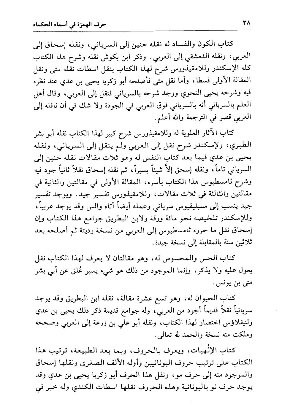 كتاب الإلهيات ويعرف بالحروف وبما بعد الطبيعة ترتيب هَذَا الكتاب عَلَى ترتيب حروف اليونانيين وأوله الألف الصغرى ونقلها إسحاق والموجود منه إِلَى حرف مو ونقل هَذَا الحرف أبو زكريا يحيى بن عدي وَقَدْ يوجد حرف تو باليونانية وهذه الحروف نقلها اسطات الكندي وله خبر فِي