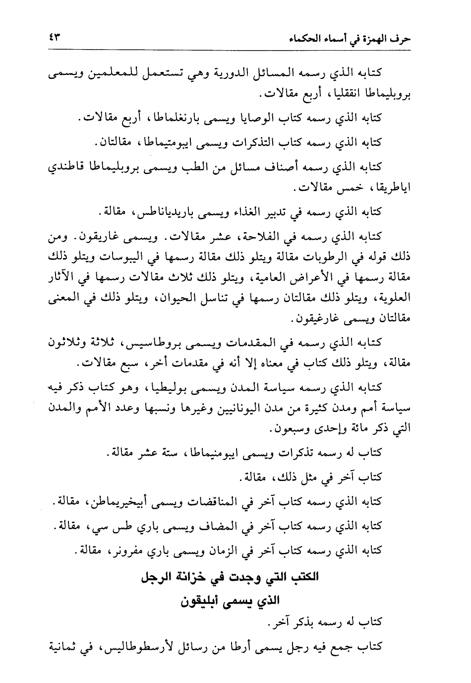 كتابه الَّذِي رسمه فِي المقدمات ويسمى بروطاسيس ثلاثة وثلاثون مقالة ويتلو ذَلِكَ كتاب فِي معناه إِلاَّ أنه فِي مقدمات أخر سبع مقالات.