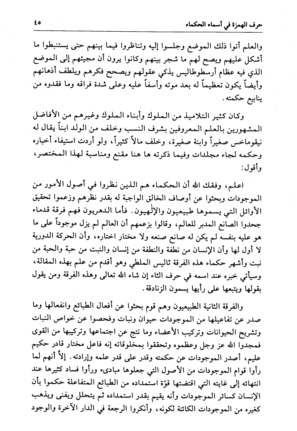 اعلم وفقك الله أن الحكماء هم الَّذِين نظروا فِي الأصول الأمور من الموجودات وبحثوا عن أوصاف الخالق الواجبة لَهُ يقدر نظرهم وزعموا تحقيق الأوائل الَّتِي يسموها طبيعيون وإلاهيون .. فأما الدهريون فهم فرقة قدماء جحدوا الصانع المدبر للعالم وقالوا يزعمهم أن العالم لَمْ يزل موجوداً عَلَى مَا هو عَلَيْهِ بنفسه لَمْ يكن لَهُ صانع صنعه ولا مختار أختاره وأن الحركة الدورية لا أول لَهَا وأن الإنسان من نطفة والنطفة من إنسان والنبت من حبة والحبة من نبت وأشهر حكماء هَذِهِ الفرقة تاليس الملطي وهو أقدم من علم بهذه المقالة وسيأتي خبره عند اسمه فِي حرف الثاء إِن شاء الله تعالى وهذه الفرقة ومن يقول يقولها ويتبعها عَلَى رأيها يسمون الزنادقة .. والفرقة الثانية الطبيعيون وهم قوم بحثوا عن أفعال الطبائع وانفعالها وَمَا صدر عن تفاعيلها من الموجودات حيوان ونبات وفحصوا هم خواص النبات وتشريح الحيوانات وتركيب الأعضاء وَمَا نتج عن اجتماعها وتركيبها من القوي فمجدوا الله عزّ وجلّ وعظموه وتحققوا بمخلوقاته أنه فاعل مختار قادر حكيم عليم أصدر الموجودات عن حكمته وقدر عَلَى قدر علمه وإرادته إِلاَّ أنهم لما رأوا قوام الموجودات من الأصول الَّتِي جعلوها مبادئ ورأوا فساد كثيرها عنه انتهائه إِلَى غايته الَّتِي اقتضتها قوة استمداده من الطبائع المتفاعلة حكموا بأن الإنسان كسائر الموجودات وأنه يقيم بقدر استمداده ثُمَّ يتحلل ويفني ويذهب كغيره من الموجودات الكائنة لكونه وأنكروا الرجعة فِي الدار الآخرة والوجود