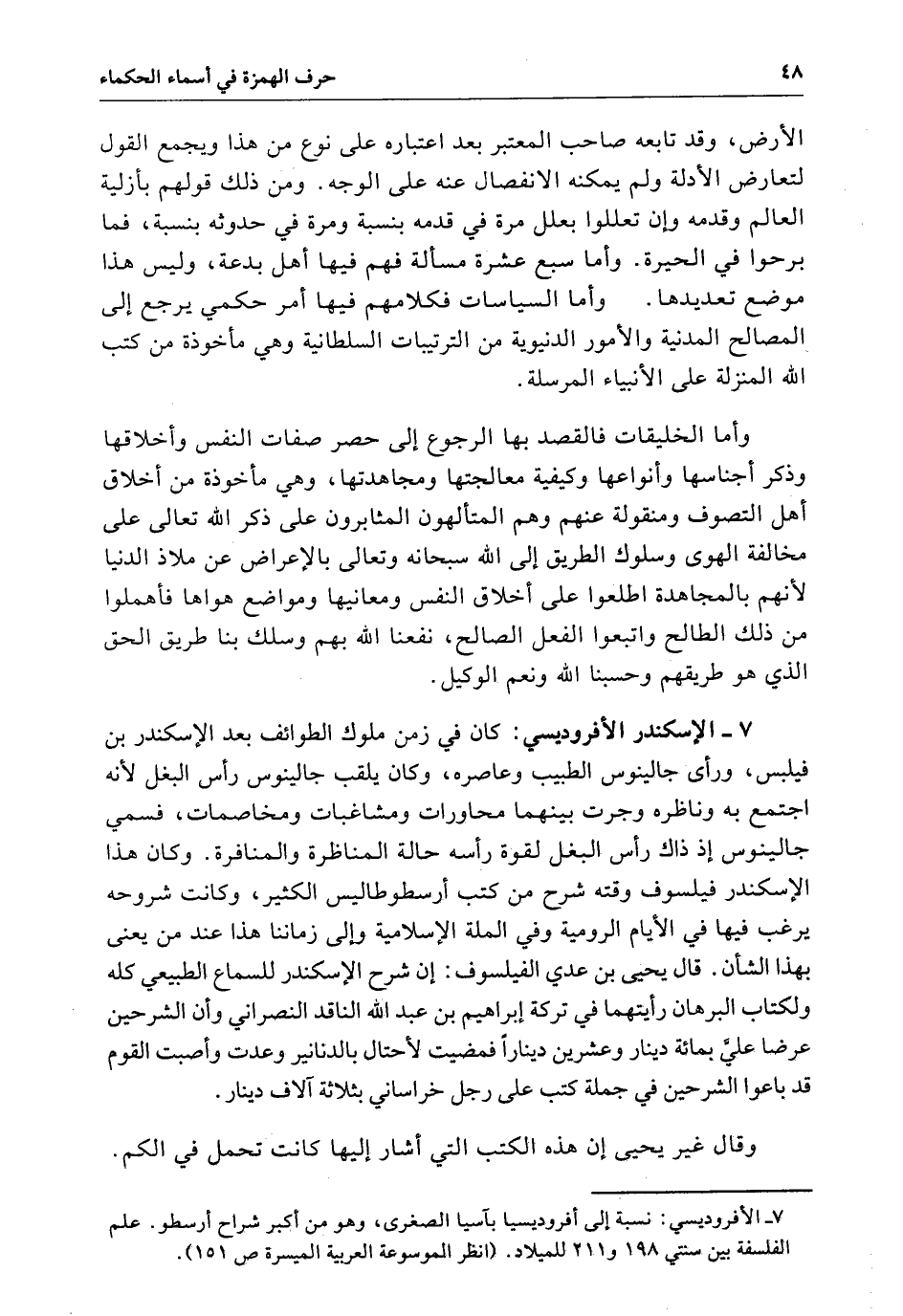 الإسكندر الأفروديسي كَانَ فِي زمن ملوك الطوائف بعد الإسكندر بن فيلبس ورأى جالينوس الطبيب وعاصره وكان يلقب جالينوس رأس البغل لأنه اجتمع بِهِ وناظره وجرت بينهما محاورات ومشاغبات ومخاصمات فسمي جالينوس إذ ذَاكَ رأس البغل لقوة رأسه حالة المناظرة والمنافرة وَكَانَ هَذَا الإسكندر فيلسوف وقته شرح من كتب أرسطوطاليس الكثير وَكَانَتْ شروحه يرغب فِيهَا فِي الأيام الرومية وَفِي الملة الإسلامية وإلى زماننا هَذَا عند من يعنى بهذا الشأن قال يحيى بن عدي الفيلسوف أن شرح الإسكندر للسماع الطبيعي كله ولكتاب البرهان رأيتهما فِي تركة إبراهيم بن عبد الله الناقد النصراني وأن الشرحين عرضا علي بمائة دينار وعشرين ديناراً فمضيت لأحتال بالدنانير وعدت وأصبت القوم قَدْ باعوا الشرحين فِي جملة كتب علي رجل خراساني بثلاثة آلاف دينار وقال غير يحيى أن هَذِهِ الكتب الَّتِي وأشار إِلَيْهَا كَانَتْ تحمل فِي الكم