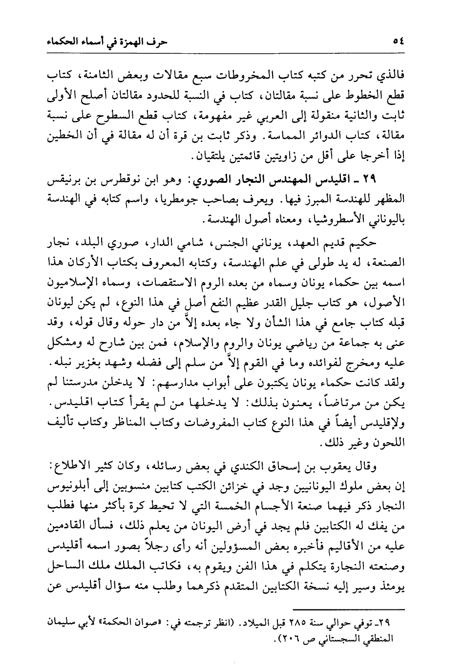 إقليدس المهندس النجار الصوري وهو ابن نوقطرس بن برنيقس المظهر للهندسة المبرز فِيهَا ويعرف بصاحب جومطريا واسم كتابه فِي الهندسة باليوناني الاسطروشيا ومعناه أصول الهندسة حكيم قديم العهد يوناني الجنس شامي الدار صوري البلد تجار الصنعة لَهُ يد طولى فِي علم الهندسة وكتابه المعروف بكتاب الأركان هَذَا اسمه بَيْنَ حكماء يونان وسماه من بعده الروم الاستقصات وسماه الإسلاميون الأصول هو كتاب جليل القدر عظيم النفع أصل فِي هَذَا النوع لَمْ يكن ليونان قبله كتاب جامع فِي هَذَا الشأن ولا جاه بعده إِلاَّ من دار حوله وقال قوله وَقَدْ عني بِهِ جماعة من رياضي يونان والروم والإسلام فمن بين شارح لَهُ ومشكل عَلَيْهِ ومخرج لفوائده وَمَا فِي القوم إِلاَّ من سلم إِلَى فضله وشهد بغزير نبله ولقد كَانَتْ حكماء يونان يكتبون عَلَى أبواب مدارسهم لا يدخلن مدرستنا لَمْ يكن من مرتاضاً يعنون بذلك لا يدخلنها من لَمْ يقرأ كتاب إقليدس ولإقليدس أيضاً فِي هَذَا النوع كتاب المفروضات وكتاب المناظر وكتاب تأليف اللحون وغير ذَلِكَ.