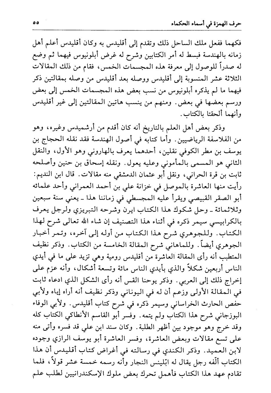 وذكر بعض أهل العلم بالتاريخ أنه كَانَ أقدم من أرشميدس وغيره وهو من الفلاسفة الرياضيين وأما كتابه فِي أصول الهندسة فقد نقله الحجاج بن يوسف بن مطر الكوفي نقلين أحدهما يعرف بالهاروني وهو الأول والنقل الثاني هو المسمى بالمأموني وعليه يعول ونقله إسحاق بن حنين وأصلحه ثابت بن قبرة الحراني ونقل أبو عثمان الدمشقي منه مقالات قال ابن نديم رأيت منها العاشرة بالموصل فِي خوانة علي بن أحمد العمراني واحد علمائه أبو الصقر القبيصي ويقرأ عَلَيْهِ المجسطي فِي زماننا هَذَا يعني سنة سبعين وثلاثمائة وحل شكوك هَذَا الكتاب ايرن وشرحه النيريزي ولرجل يعرف بالكرابيسي سيمر ذكره فِي أثناء هَذَا التصنيف إِن شاء الله تعالى شرح لهذا الكتاب وللجوهري شرح هَذَا الكتاب من أوله إِلَى آخره وتمر أخبار الجوهري أيضاً وللماهاني شرح المقالة الخامسة من الكتاب وذكر نظيف المتطبب أنه رأى المقالة العاشرة من إقليدس رومية وهي نزيد عَلَى مَا فِي أيدي الناس أربعين شكلاً والذي بأيدي الناس مائة وتسعة أشكال وإنه عزم عَلَى إخراج ذَلِكَ إِلَى العربي وذكر يوحنا القس أنه رأى الشكل الَّذِي ادعاه ثابت فِي المقالة الأولى وزعم أن لَهُ فِي اليوناني وذكر نظيف أنه أراه إياه ولأبي حفص الحارث الخراساني وسيمر ذكره فِي شرح كتاب إقليدس ولأبي الوفاء البوزجاني شرح هَذَا الكتاب وَلَمْ يتمه وفسر أبو القاسم الأنطاكي الكتاب كله وَقَدْ خرج وهو موجود بَيْنَ أظهر الطلبة وَكَانَ سند ابن علي قَدْ فسره وأتى منه عَلَى تسع مقالات وبعض العاشرة وفسر العاشرة أبو يوسف الرازي وجوده لابن العميد وذكر الكندي فِي رسالته فِي أغراض كتاب إقليدس أن هَذَا الكتاب ألفه رجل يقال لَهُ لبلّينس النجار وأنه رسمه خمسة عشر قولاً فلما تقادم عهد هَذَا الكتاب فأهمل تحرك بعض ملوك الإسكندرانيين لطلب علم