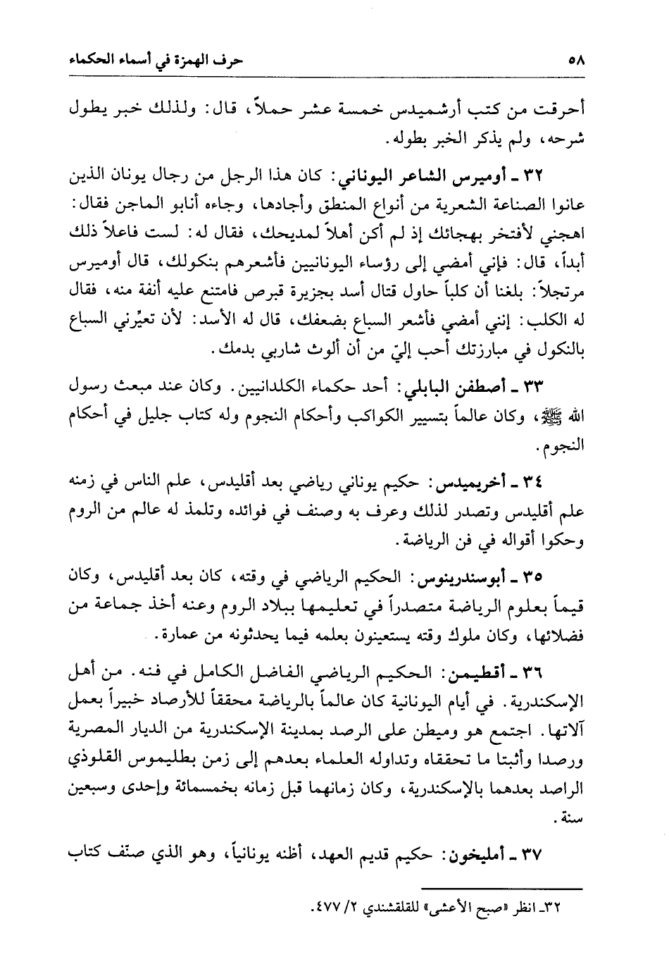 أحرقت من كتب ارشميدس خمسة عشر حملاً قال ولذلك خبر يطول شرحه وَلَمْ يذكر الخبر بطوله.
