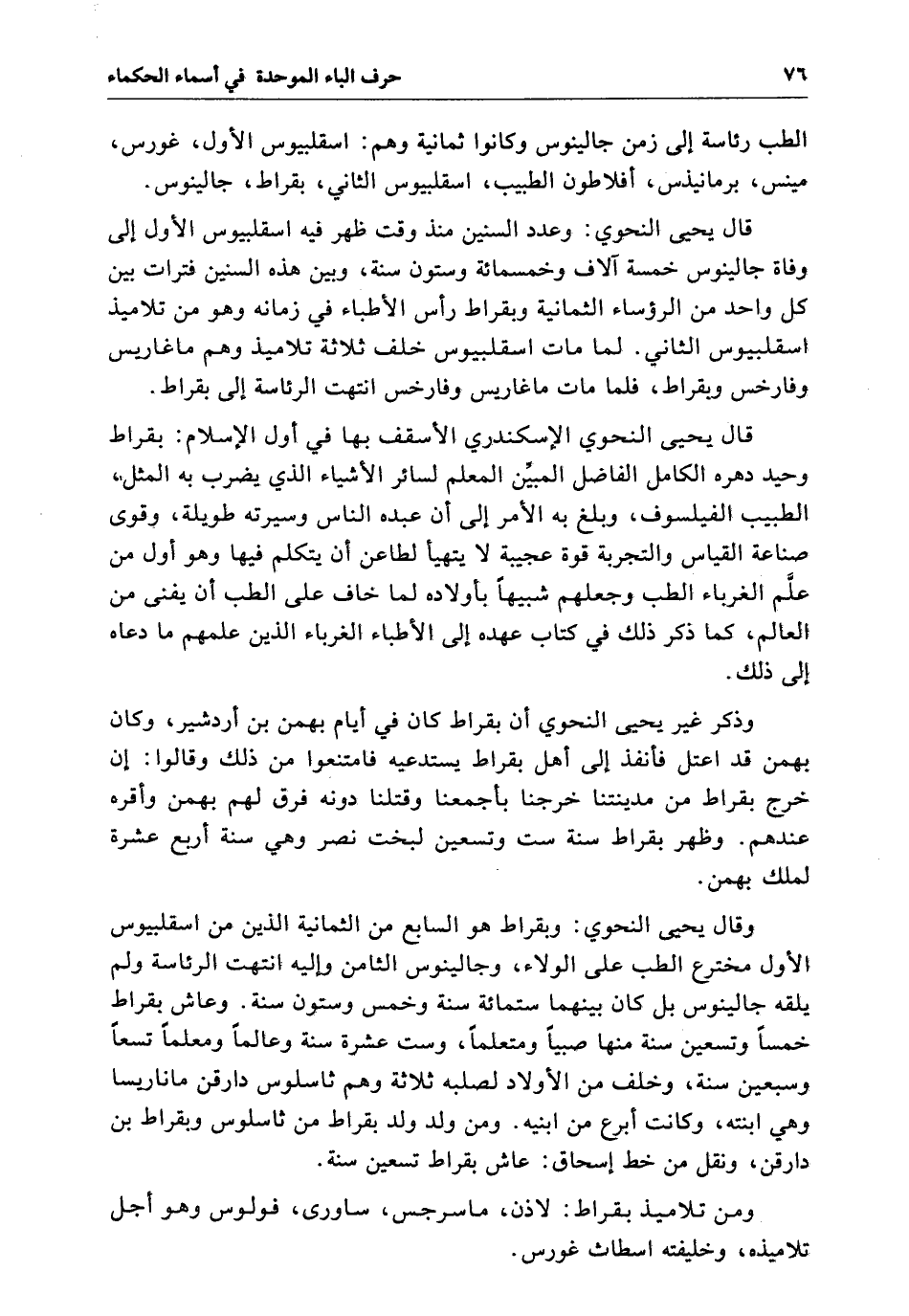 قال يحيى النحوي وعدد السنين منذ وقت ظهر فِيهِ اسقلبيوس الأول إِلَى وفاة جالينوس خمسة آلاف وخمسمائة وستون سنة وبين هَذِهِ السنين فترات بَيْنَ كل واحد من الرؤساء الثمانية وبقراط رأس الأطباء فيزمانه وهو من تلاميذ اسقلبيوس الثاني لما مات اسقلبيوس خلف ثلاثة تلاميذ وهم ماغاريس وفارخس وبقراط فلما مات ماغاريس وفارخس انتهت الرئاسة إِلَى بقراط قال يحيى النحوي الإسكندري الأسقف بِهَا فِي أول الإسلام بقراط وحيد دهره الكامل الفاضل المبين المعلم لسائر الأشياء الَّذِي يضرب بِهِ المثل الطبيب الفيلسوف وبلغ بِهِ الأمر إلى أن عبده الناس وسيرته طويلة وقوى صناعة القياس والتجربة قوة عجيبة لا يتهيأ لطاعن أن يتكلم فِيهَا وهو أول من علم الغرباء الطب وجعلهم شبيهاً بأولاده لما خاف عَلَى الطب أن يفنى من العالم كما ذكر ذَلِكَ فِي كتاب عهده إِلَى الأطباء الغرباء الذين علمهم مَا دعاه إِلَى ذَلِكَ وذكر غير يحيى النحوي أن بقراط كَانَ فِي أيام بهمن بن أردشير وَكَانَ بهمن قَدْ اعتل فأنفذ إلى أهل بلد بقراط يستدعيه فامتنعوا من ذَلِكَ وقالوا إن خرج بقراط من مدينتنا خرجنا بأجمعنا وقتلنا فرق لهم بهمن وأقره عندهم وظهر بقراط سنة ست وتسعين لبخت نصر وهي سنة عشرة لملك بهمن.