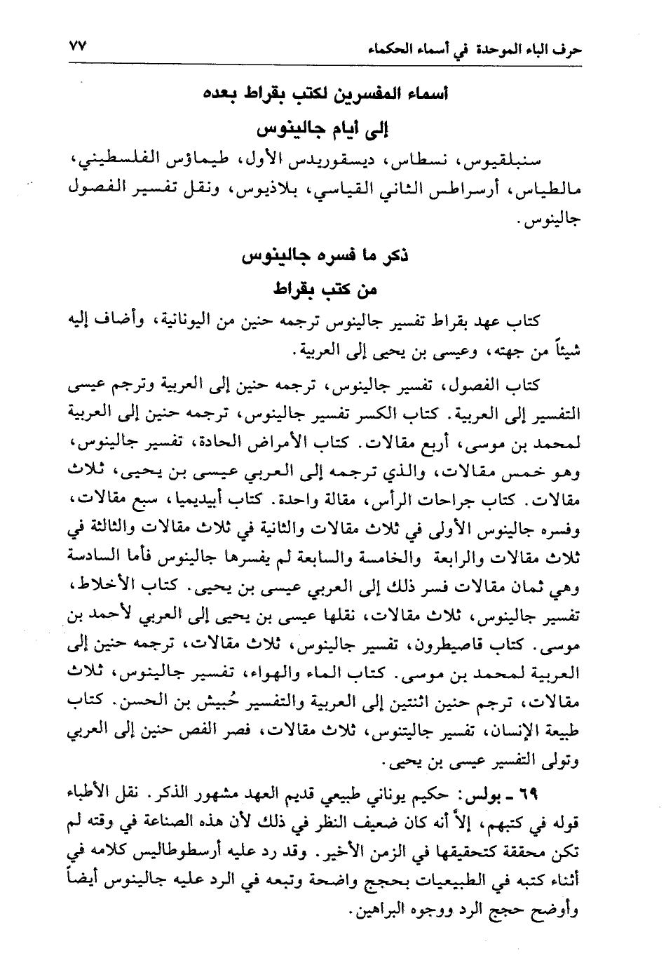 ذكر مَا فسره جالينوس من كتب بقراط. كتاب عهد بقراط تفسير جالينوس ترجمه حنين من اليونانية وأضاف إِلَيْهِ شيئاً من جهته وعيسى ين يحيى إِلَى العربية. كتاب الفصول تفسير جالينوس ترجمه حنين إِلَى العربية وترجم عيسى التفير إِلَى العربية. كتاب الكسر تفسير جالينوس ترجمه حنين إِلَى العربية لمحمد بن موسى أربع مقالات. كتاب الأمراض الحادة تفسير جالينوس وهو خمس مقالات والذي ترجمه إِلَى العربي عيسى بن يحيى ثلاث مقالات. كتاب جراحات الرأس مقالة واحدة. كتاب ابيذيميا سبع مقالات وفسره جالينوس الأولى فِي ثلاث مقالات والثانية فِي ثلاث مقالات والثالثة فِي ثلاث مقالات والرابعة والخامسة والسابعة لَمْ يفسرها جالينوس فأما السادسة وهي ثمان مقالات فسر ذَلِكَ إِلَى العربي عيسى بن يحيى. كتاب الأخلاط تفسير جالينوس ثلاث مقالات نقلها عيسى بن يحيى إِلَى العربي لأحمد بن موسى. كتاب قاصيطرون تفسير جالينوس ثلاث مقالات ترجمه حنين إِلَى العربية لمحمد بن موسى. كتاب الماء والهواء تفسير جالينوس ثلاث مقالات ترجم حنين اثنتين إِلَى العربية والتفسير حُبيش بن الحسن. كتاب طبيعة الإنسان تفسير جالينوس ثلاث مقالات فسر الفص حنين إِلَى العربي وتولى التفسير عيسى بن يحيى.