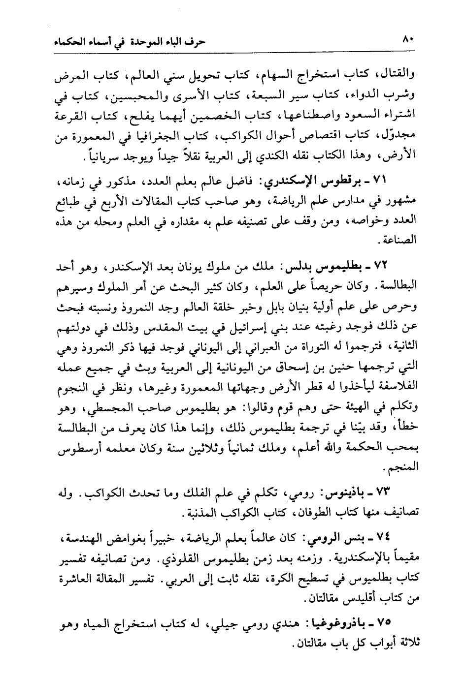 برقطوس الإسكندري فاضل عالم بعلم العدد مذكور فِي وزمانه مشهور فِي مدارس علم الرياضة وهو صاحب كتاب المقالات الأربع فِي طبائع العدد خواصه ومن وقف عَلَى تصنيفه علم بِهِ مقداره فِي العلم ومحله من هَذِهِ الصناعة.