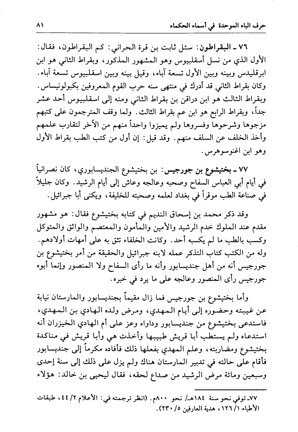 البقراطزن سئل ثابت بن قرة الحراني كم البقراطون فقال الأول الَّذِي من نسل اسقلبيوس وهو المشهور المذكور وبقراط الثاني وهو ابن أبرقليدس وبينه وبين الأول تسعة آباء وقيل بينه وبين اسقلبيوس تسعة آباء وَكَانَ بقراط الثاني قَدْ أدرك فِي منتهى سنة حرب القوم المعروفين بكبولونيساس وبقراط الثالث هو ابن دراقن بن بقراط الثاني ومنه إِلَى اسقلبيوس أحد عشر جدّاً وبقراط الرابع هو ابن عم بقراط الثالث ولما وقف المترجمون عَلَى كتبهم مزجزها وشرحوها وفسروها وَلَمْ يميزوا واحداً منهم من الآخر لتقارب علمهم وأخذ الخلف عن السلف منهم وَقَدْ قيل أن أول من كتب الطب بقراط الأول وهو ابن اغنوبهوهوس.
