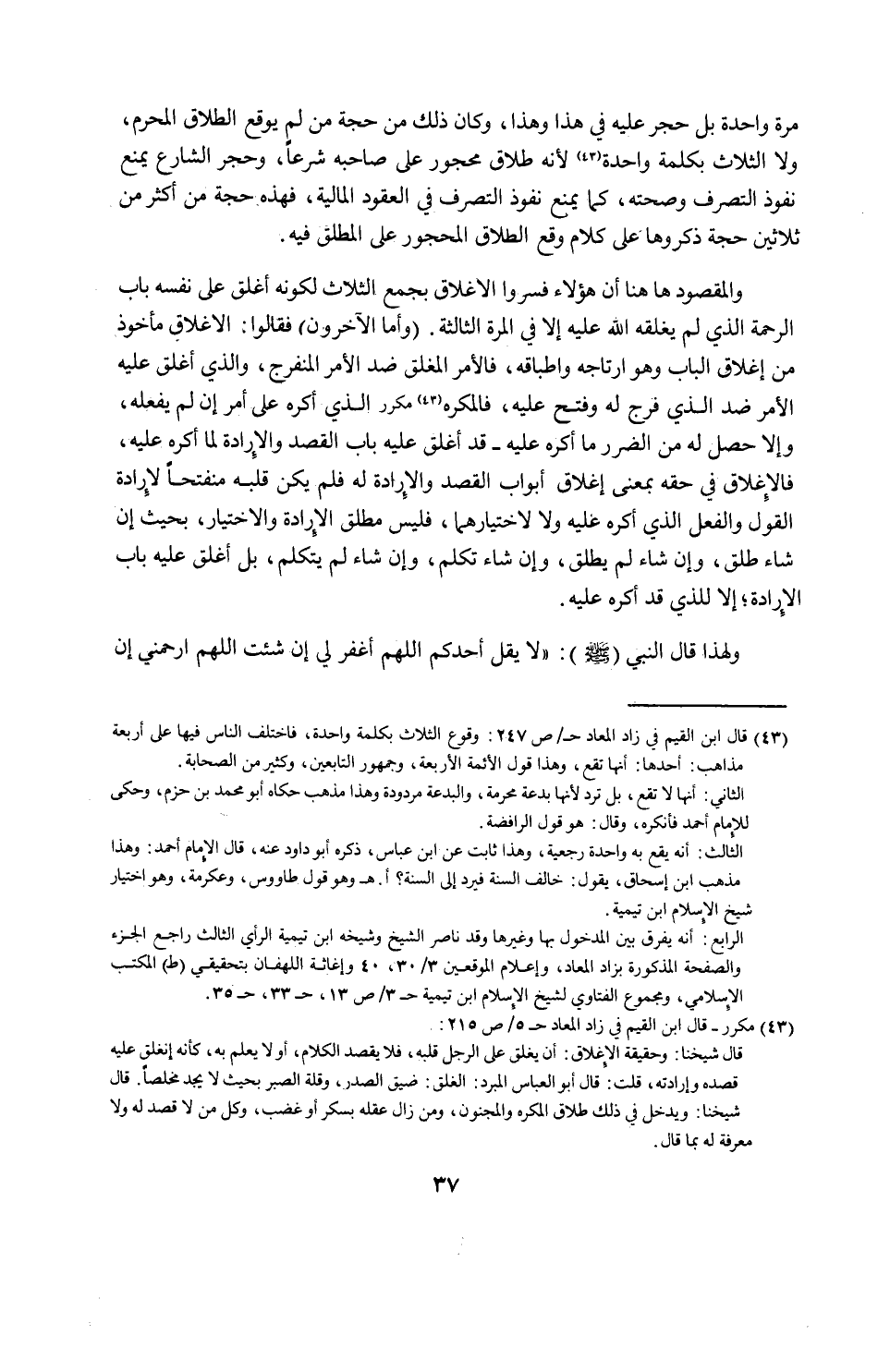 مرة واحدة بل حجر عليه في هذا وهذا وكان ذلك من حجة من لم يوقع الطلاق المحرم ولا الثلاث بكلمة واحدة لانه طلاق محجور على صاحبه شرعا وحجر الشارع يمنع نفوذ التصرف وصحته كما يمنع نفوذ التصرف في العقود المالية فهذه حجة من اكثر من ثلاثين حجة ذكروها على كلام وقع الطلاق المحجور على المطلق فيه. والمقصود هاهنا ان هؤلاء فسروا الاغلاق بجمع الثلاث لكونه اغلق على نفسه باب الرحمة الذي لم يغلقه الله عليه الا في المرة الثالثة "واما الآخرون" فقالوا: الإغلاق مأخوذ من إغلاق الباب وهو ارتاجه واطباقه فالأمر المغلق ضد الأمر المنفرج والذي أغلق عليه الأمر ضد الذي فرج له وفتح عليه فالمكره "مكرر" الذي اكره على أمر إن لم يفعله وإلا حصل له من الضرر ما اكره عليه قد أغلق عليه باب القصد والإرادة لما اكره عليه فالإغلاق في حقه بمعنى أغلاق أبواب القصد والإرادة له فلم يكن قلبه منفتحا لإرادة القول والفعل الذي اكره عليه ولا لاختيارهما فليس مطلق الإرادة والاختيار بحيث إن شاء طلق وان شاء لم يطلق وان شاء تكلم وان شاء لم يتكلم بل أغلق عليه باب الإرادة إلا للذي قد اكره عليه. ولهذا قال النبي صلى الله عليه وسلم "لا يقل أحدكم اللهم اغفر لي إن شئت اللهم ارحمني إن