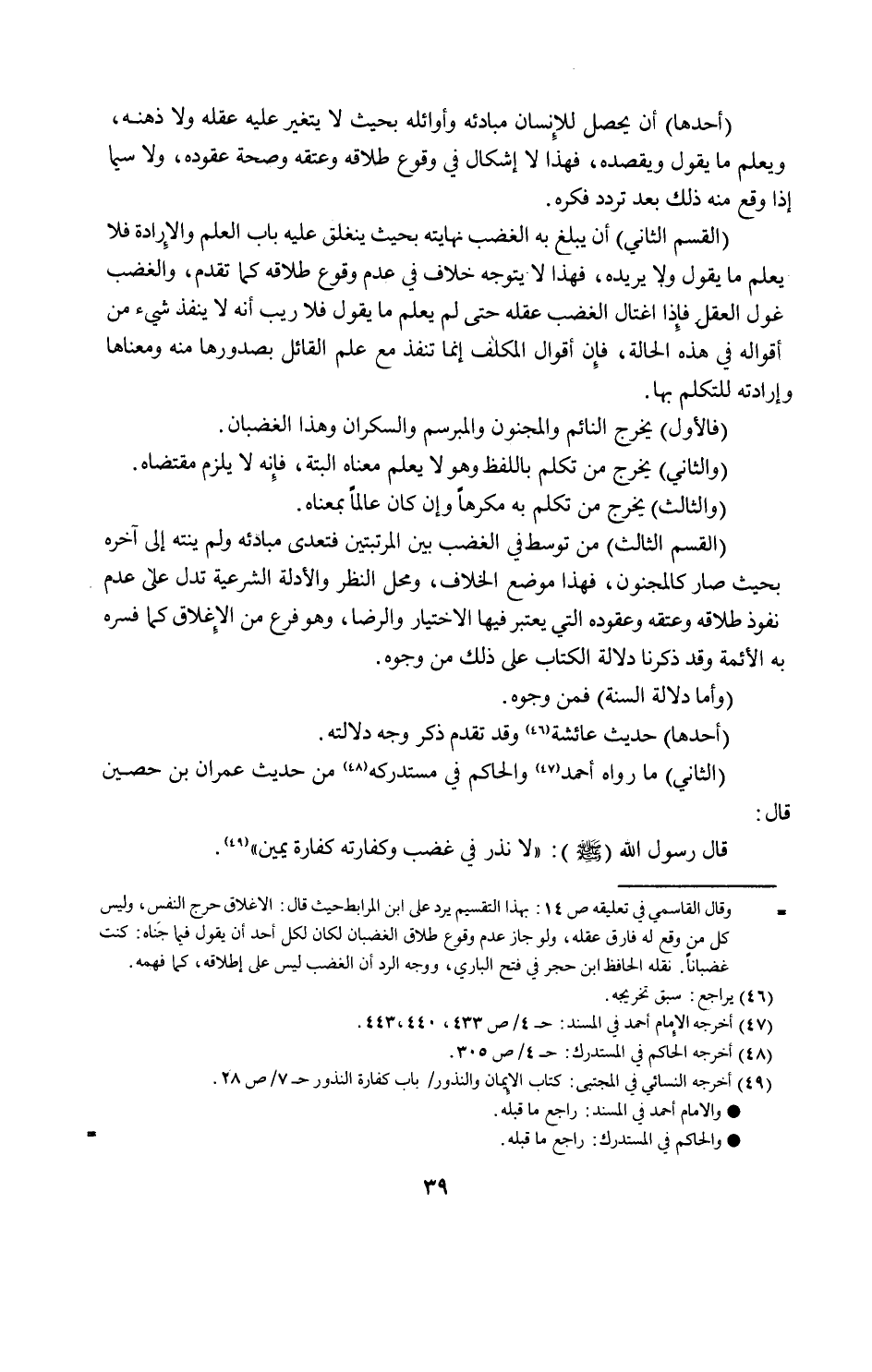 "احدها" إن يحصل للإنسان مبادئه وأوائله بحيث لا يتغير عليه عقله ولا ذهنه ويعلم ما يقول وما يقصده فهذا لا إشكال في وقوع طلاقه وعتقه وصحة عقوده ولا سيما إذا وقع منه ذلك بعد تردده فكره "القسم الثاني" أن يبلغ به الغضب نهايته بحيث ينغلق عليه باب العلم والإرادة فلا يعلم ما يقول ولا يريده فهذا لا يتوجه خلاف في عدم وقوع طلاقه كما تقدم والغضب غول العقل فإذا اغتال الغضب عقله حتى لم يعلم ما يقول فلا ريب انه لا ينفذ شيء من أقواله في هذه الحالة فإن أقوال المكلف إنما مع علم القائل بصدورها منه ومعناها وإرادته للتكلم بها. "فالأول" يخرج النائم والمجنون والمبرسم والسكران وهذا الغضبان "والثاني" يخرج من تكلم باللفظ وهو لا يعلم معناه البتة فإنه لا يلزم مقتضاه "والثالث" يخرج من تكلم به مكرها وان كان عالما بمعناه. "القسم الثالث" من توسط في الغضب بين المرتبتين فتعدى مبادئه ولم ينته إلى أخره بحيث صار كالمجنون فهذا موضع الخلاف ومحل النظر والأدلة الشرعية تدل على عدم نفوذ طلاقه وعتقه وعقوده التي يعتبر فيها الاختيار والرضا وهو فرع من الاغلاق كما فسره به الأئمة وقد ذكرنا دلالة الكتاب على ذلك من وجوه.
