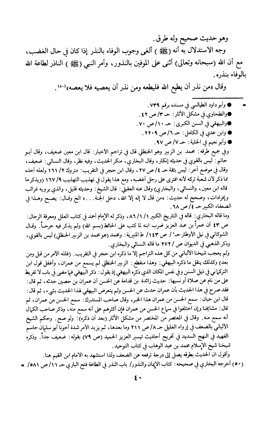 وهو حديث صحيح وله طرق وجه الاستدلال به أنه صلى الله عليه وسلم الغي وجوب الوفاء بالنذر إذا كان في حال بالغضب مع أن الله "سبحانه وتعالى" اثنى على الموفين بالنذور وأمر النبي صلى الله عليه وسلم الناذر لطاعة الله بالوفاء بنذره. وقال "من نذر أن يطيع الله فليطعمه ومن نذر أن يعصيه فلا يعصه".
