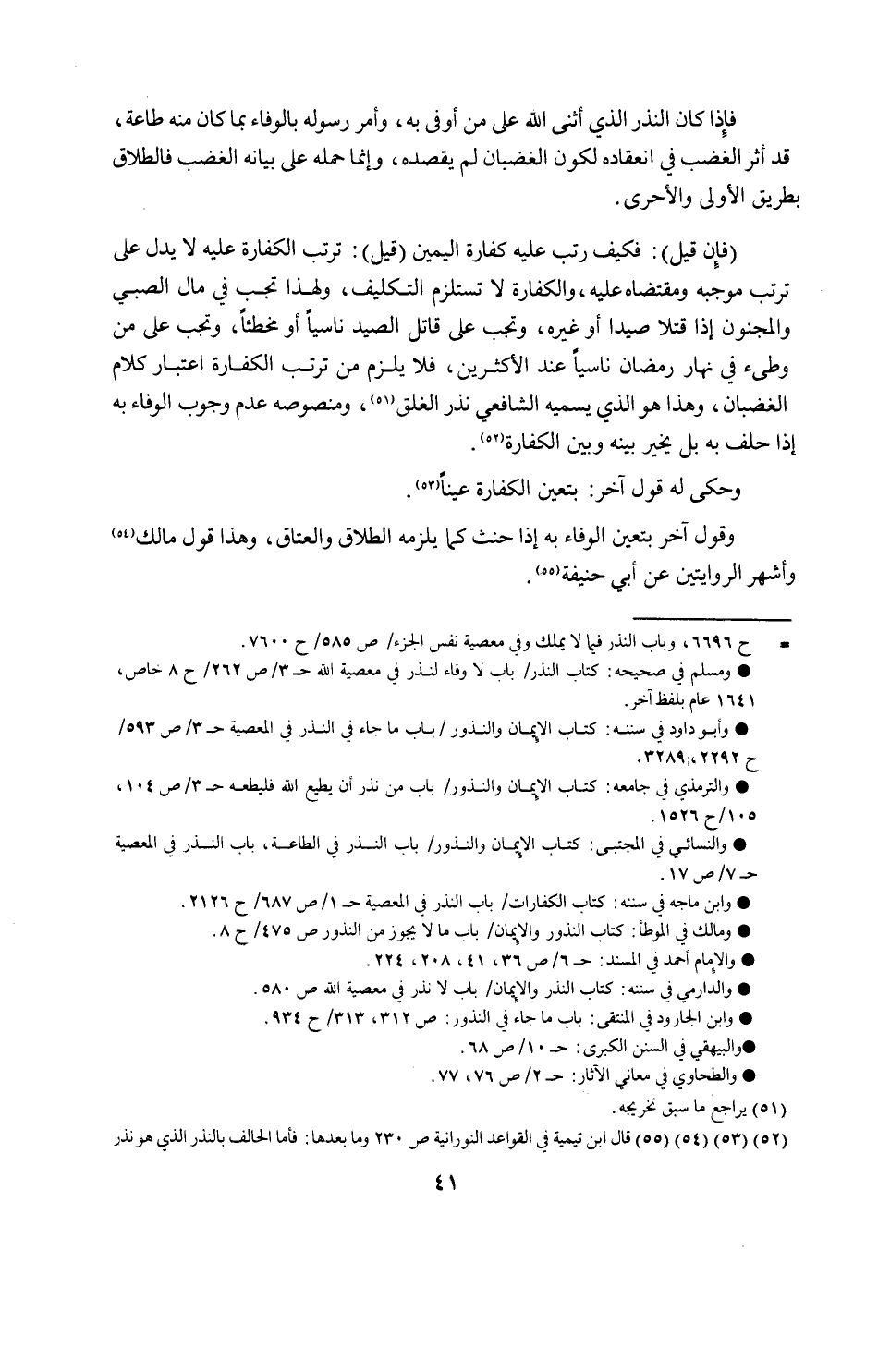 فإذا كان النذر الذي أثنى الله من أوفى به وأمر رسوله بالوفاء بما كان منه طاعة قد اثر الغضب في انعقاده لكون الغضبان لم يقصده وإنما حمله على بيانه الغضب فالطلاق بطريق الأولى والأخرى فإن قيل: فكيف رتب عليه كفارة اليمين "قيل" ترتب الكفارة عليه لا يدل على ترتب موجبه ومقتضاه عليه والكفارة لا تستلزم التكليف ولهذا تجب في مال الصبي والمجنون إذا قتلا صيدا أو غيره وتجب على قاتل الصيد ناسيا أو مخطئا وتجب على من وطئ في نهار رمضان ناسيا عند الأكثرين فلا يلزم من ترتب الكفارة اعتبار كلام الغضبان وهذا هو الذي يسميه الشافعي نذر الغلق ومنصوصه عدم وجوب الوفاء به إذا حلف به بل يخير بينه وبين الكفارة. وحكى له قول آخر بتعين الكفارة عينا وقول آخر بعين الوفاء به إذا حنث كما يلزمه الطلاق والعتاق وهذا قول مالك واشهر الروايتين عن أبي حنيفة